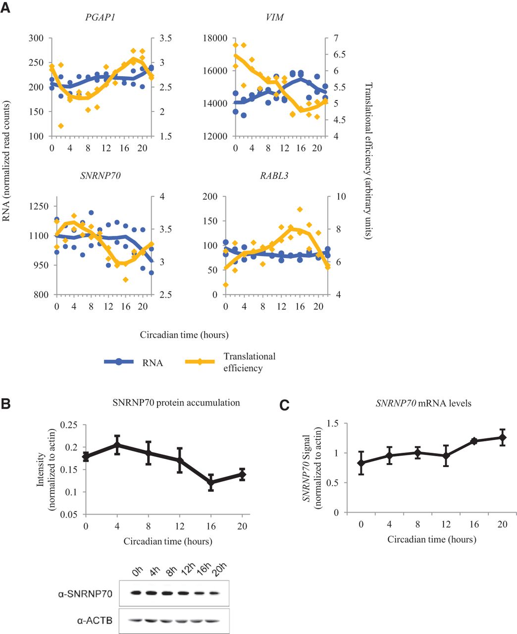Analysis of genes that are translationally regulated by the circadian clock. (A) Traces for RNA and translational efficiency (TE) from PGAP1, VIM, SNRNP70, and RABL3 are plotted as a function of time. Blue traces for the RNA data use the axes on the left. Yellow traces for the TE data use the axes on the right. Points from both replicates are displayed, and the lines are plotted using a moving average (see Supplemental Methods for further detail). Traces from siARNTL libraries are displayed in Supplemental Figure S10. (B) The average SNRNP70 band intensity from eight protein immunoblots in wild-type synchronized U2OS cells is plotted as a function of time. A representative Western blot is shown at the bottom. (C) Average quantitative PCR measurements of SNRNP70 mRNA. All measurements were normalized to beta-actin. Error bars represent standard error of the mean.