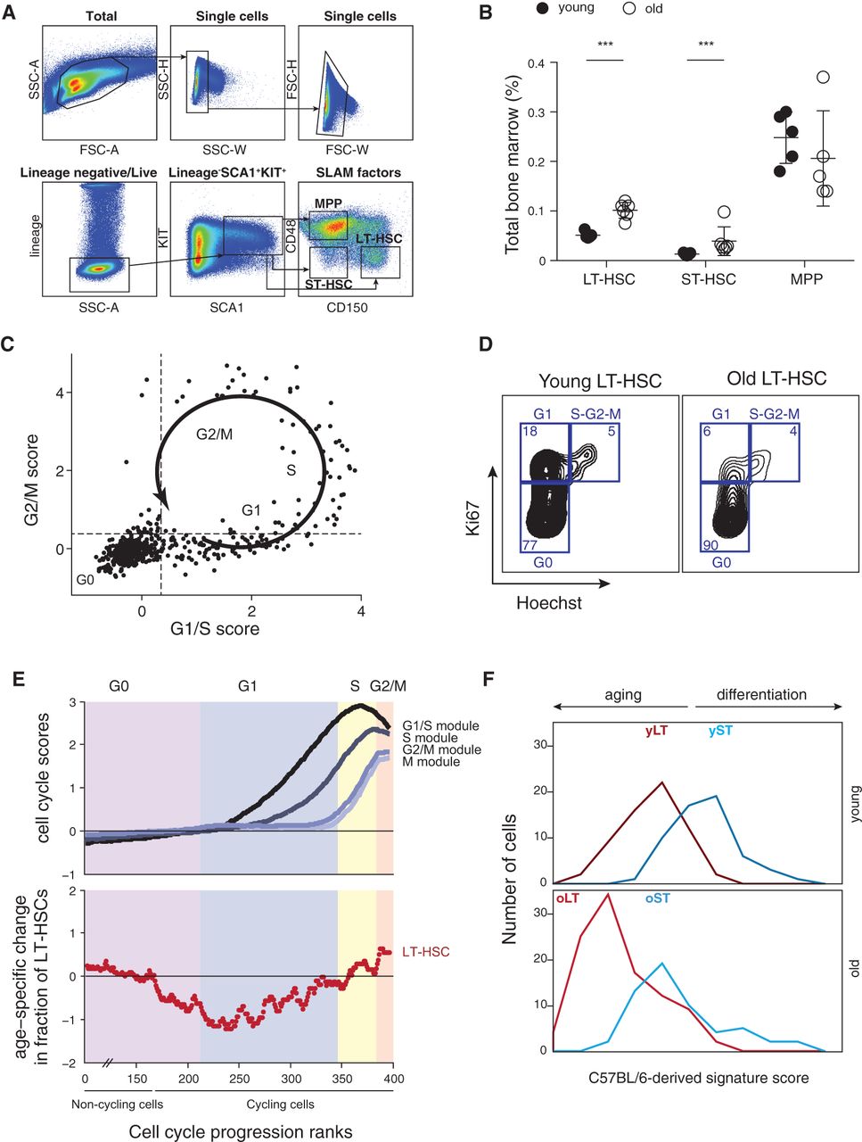 Age associated changes are conserved in DBA/2. (A) Gating strategy used to isolate LT-HSCs (LSK CD150+CD48−), ST-HSCs (LSC CD150−CD48−), and MPPs (LSK CD150−CD48+) from the BM of young (6–12 wk) DBA/2 mice. (B) LT-HSC compartment expands during aging. Shown are frequencies of LT-HSCs, ST-HSCs, and MPPs (x-axis) in young (black) and old (white) DBA/2 mice as a percentage of BM. Statistically significant differences: (***) P < 0.001. (C) Cell cycle trajectory inferred from single-cell RNA-seq. Shown is the average expression of G1/S genes (x-axis) and G2/M genes (y-axis). The arrow and labels reflect inferred cell cycle progression. (D) Representative FACS plots for Ki67/Hoechst intracellular staining in young and old LT-HSCs from DBA/2 mice. (E) Cell cycle distribution changes with age. (Top) Cells were ordered according to their inferred cell cycle progression, and the average expression of G1/S, S, and G2/M genes (y-axis, curves from dark to light gray) was calculated with a sliding window of 11 cells (x-axis). The first approximately 217 cells are “noncycling,” and only a small portion of them is depicted in the graph. The G0/G1 approximate border was defined as the first position with a positive G1/S score (i.e., above the average of all cells), and other borders were approximated by manual inspection of the figure. (Bottom) For each cell type, the log2 of the ratio between percentages of old cells divided by the percentage of young cells along the inferred cell cycle progression (with a sliding window of 100 cells) is shown. Shaded colors reflect the inferred cell cycle phases; cells are ordered by the analysis of the top panel. (F) Distribution of the C57BL/6-derived signature scores for young and old LT-HSCs and ST-HSCs, defined as the average normalized expression of young LT-HSC–enriched (dark red), old LT-HSC–enriched (light red), young ST-HSC–enriched (dark blue), and old ST-HSC–enriched (light blue) genes (x-axis), respectively.