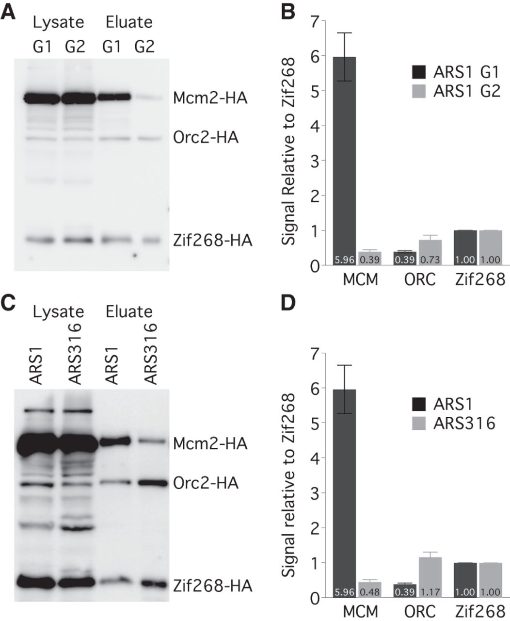 ARS1 has multiple MCM complexes loaded in vivo. (A) HA Western blot of protein from Mcm2-HA, Orc2-HA, Zif268-HA cells (yFS853) before and after affinity purification of an ARS1-containing TALO8 plasmid. G1 cells were arrested in α-factor; G2 cells were arrested in nocodazole. (B) Quantitation of eluate data in A: n = 7 for G1; n = 3 for G2; error bars represent SEM. (C) Western blot as in A from G1-arrested cells carrying an ARS1-containing (yFS853) or ARS316-containing (yFS855) TALO8 plasmid. (D) Quantitation of data in C: n = 7 for ARS1, n = 3 for ARS316, error bars represent SEM.
