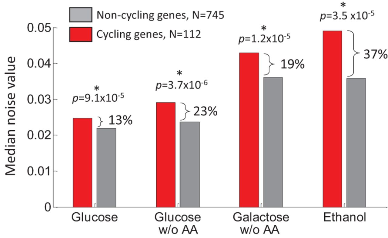 Cell-cycle–regulated genes have higher variability levels. For each condition, the median noise level is shown for genes that cycle with the cell cycle (red bars) or not (gray bars), as previously defined by Spellman et al. (1998). In all conditions, cycling genes display higher variability levels than noncycling genes. P-values are for paired K–S tests (Supplemental Fig. S15).
