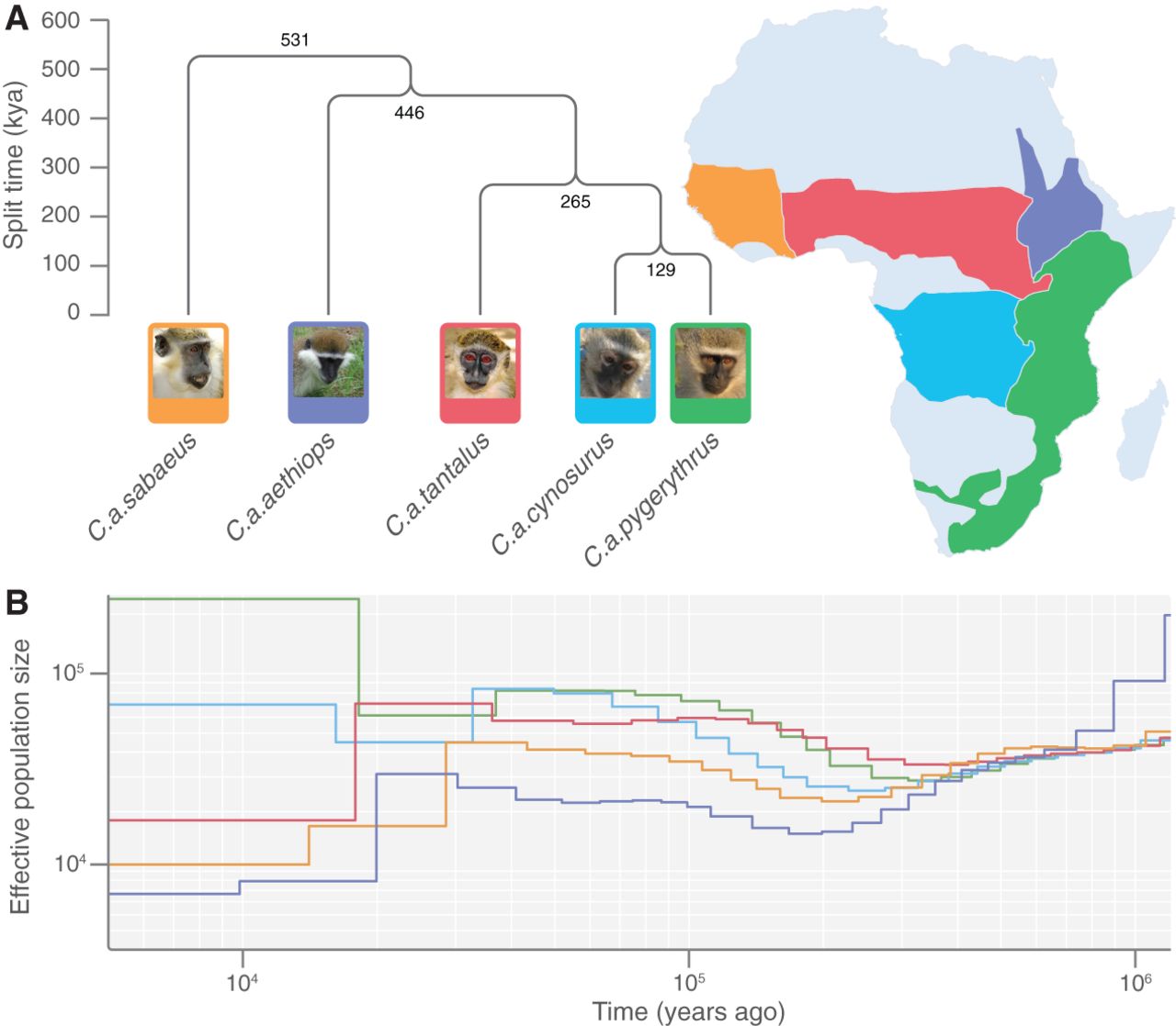 The phylogenetic tree, geographical distribution, and population history of vervet subspecies. (A) Subspecies relationships were obtained by applying a clustering algorithm to the pairwise distance matrix. The tree is rooted using rhesus macaque as an outgroup, and the estimated geographical distribution of each subspecies based on previous field studies used to characterize endangered species (www.iucnredlist.org) is displayed to the right. (B) The inferred effective population size across time (both on log-scale) for each subspecies sample inferred with the multiple sequentially Markovian coalescent (MSMC) software in two-haplotype mode (Schiffels and Durbin 2014).