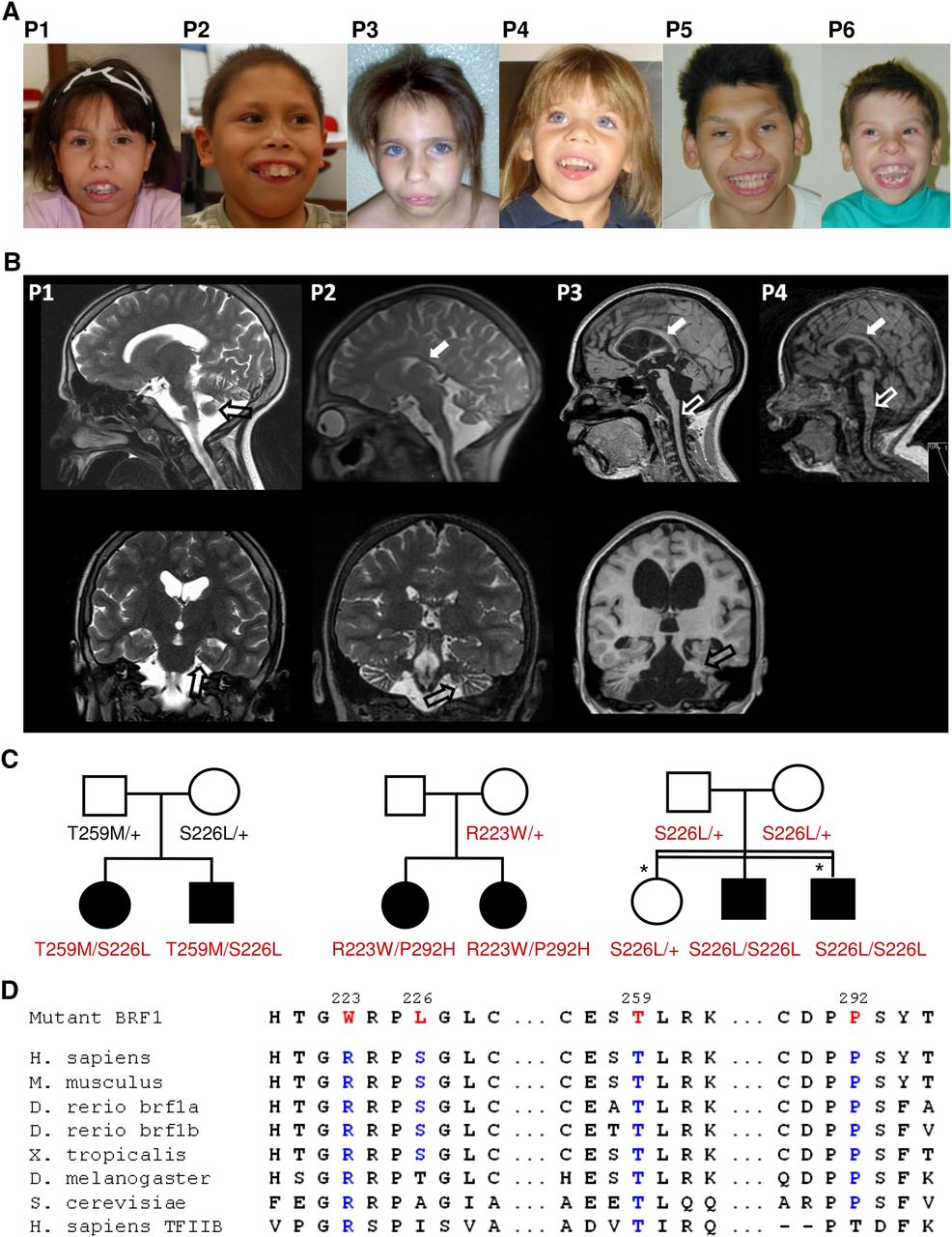 BRF1 mutations cause a cerebellar-dental-skeletal syndrome. (A) Patients 1 and 2 (family 1) at the ages of 12 and 10 yr, patients 3 and 4 (family 2) at the ages of 10 and 4 yr, and patients 5 and 6 (family 3). Note characteristic facial dysmorphism and dental anomalies. (B) Brain MRI (top, sagittal scans; bottom, coronal scans) of patients 1–4 (P1–P4) at the ages of 14 yr, 9 yr, 12 yr, and 18 mo, respectively, showing a thin corpus callosum (white filled arrows), flattened brainstem (white unfilled arrows), and cerebellar hypoplasia (black unfilled arrows). (C) Pedigrees of family 1 (left), family 2 (middle), and family 3 (right) with genotypes for BRF1 missense alterations. In family 2, the p.Pro292His mutation was likely transmitted by the unaffected father who did not participate in the study. In family 3, the two individuals denoted by an asterisk had Leber congenital amaurosis caused by a homozygous RDH12 mutation. (D) Multiple sequence alignment of BRF1 orthologs and human TFIIB showing evolutionary conservation of mutant BRF1 amino acid residues.