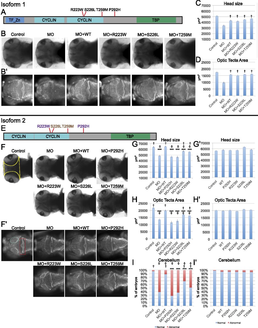 Functional annotation of variants in isoforms 1 and 2 of BRF1 and its effects on the head size, optic tectum size, and cerebellar formation in zebrafish embryos. (A,E) Schematic representation of the location of BRF1 variants examined in zebrafish within each of the two isoforms evaluated: isoform 1 (NP_001229717.1; 650 aa) and isoform 2 (NP_001229715.1; 584 aa). In purple are alleles that when tested are shown to be null, and in brown are alleles that score as hypomorphs based on zebrafish assays. (B,B′) Dorsal views of control zebrafish embryos and embryos injected with brf1b MO, brf1b MO + WT human BRF1, and brf1bMO + variant (R223W, S226L, or T259M) human BRF1 RNA in the context of isoform 1, respectively, at 3 d.p.f., stained with anti-α acetylated tubulin. (B) Head size measurements were taken using brightfield images (highlighted with a yellow outline in panel F). (B′) The area of the optic tecta was measured in the fluorescent images (highlighted with a cyan oval in panel F′). (C,D) Bar graphs showing the relative head size (C) and the optic tecta area (D). Data are presented as mean ± SE. Two-tailed t-tests were performed to assess statistical significance. The embryos coinjected with the MO and each of the variants were statistically different from MO alone but not statistically different when compared to embryos injected with MO + WT human BRF1, therefore scoring as benign. (F–I′) Functional assessment of the BRF1 missense variants in the context of isoform 2. Three d.p.f. embryos injected with brf1b MO, brf1b MO + WT human BRF1, brf1b MO + variant human BRF1 RNA (P292H, R223W, S226L, or T259M), or variant human BRF1 RNA alone in the context of isoform 2 were observed following staining with anti-α acetylated tubulin for head size (F) and for optic tecta area (F′), as well as for cerebellar defects (F′; illustrated with a red dashed box where maximum disorganization is observed). (G–I′) Bar graphs showing average head size, optic tecta area, as well as the percentage of embryos with cerebellar defects evaluated among each condition. To assess statistical significance among the evaluated conditions, two-tailed t-tests were performed for head size and optic tecta, and χ2 tests were performed for cerebellar disorganization to evaluate statistical significance across the conditions. In the context of isoform 2, functional analysis using zebrafish show that P292H and R223W are null, while S226L and T259M are hypomorphic alleles, showing an isoform-specific effect in which head size and optic tecta size are reduced and cerebellar disorganization occurs. No significant effects were observed for any of the phenotypes when the variants themselves were overexpressed. Each experiment was done at minimum in triplicate with at least 50 embryos per condition per replicate. (***) P-value ≤ 0.001 relative to MO + WT; (◊) P-value ≤ 0.001 relative to controls; (†) P-value ≤ 0.01 relative to MO.