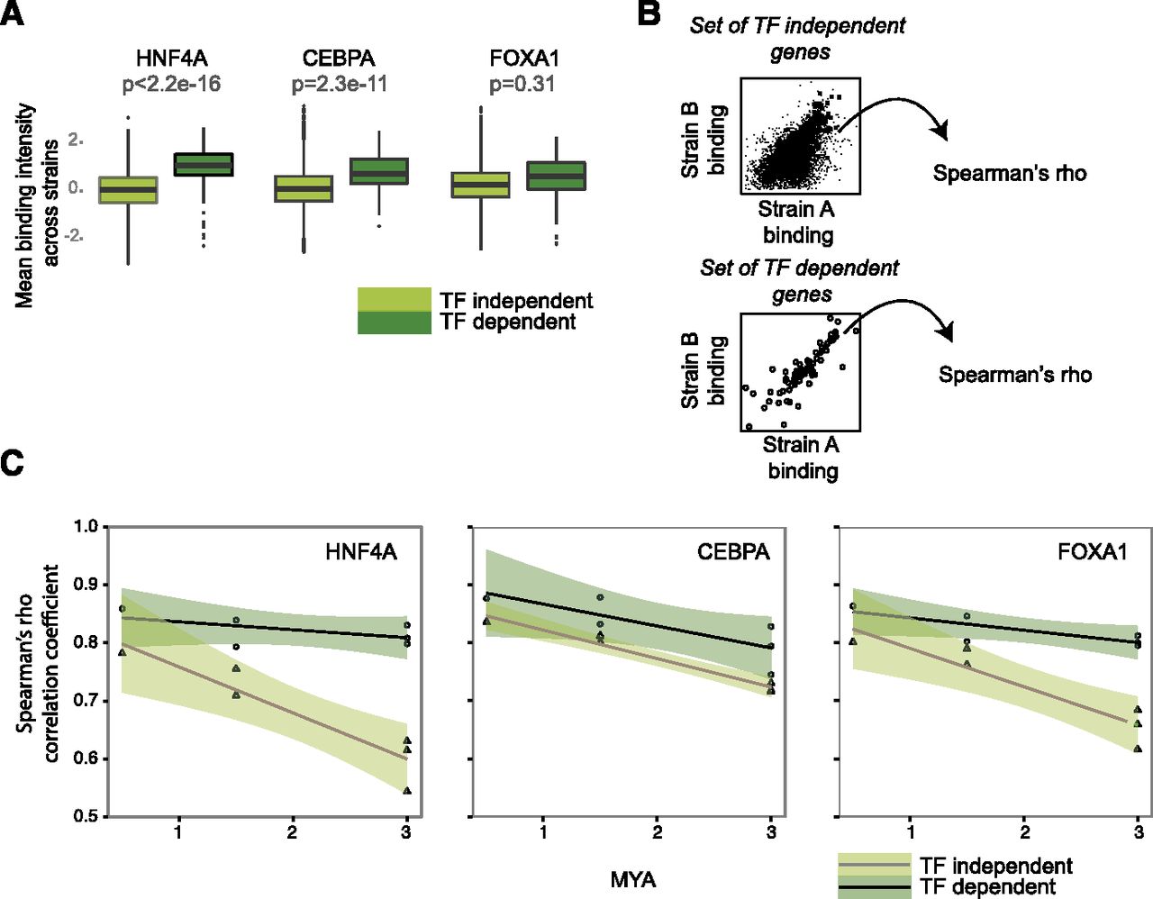 Collective binding intensity is conserved near TF-dependent genes. (A) Boxplots comparing collective binding intensities between TF dependent and TF independent for each TF (values are averaged across species). P-values were calculated using the Mann-Whitney U test. (B) Correlation coefficients (Spearman’s rho) were derived from pairwise comparison of collective binding values between taxa for both TF-dependent and TF-independent genes. (C) Decay of TF binding correlation coefficient over evolutionary time for the three TFs. TF-dependent genes tend to show greater conservation of collective binding intensity compared to TF-independent genes. Shaded areas represent point-wise 95% confidence intervals.