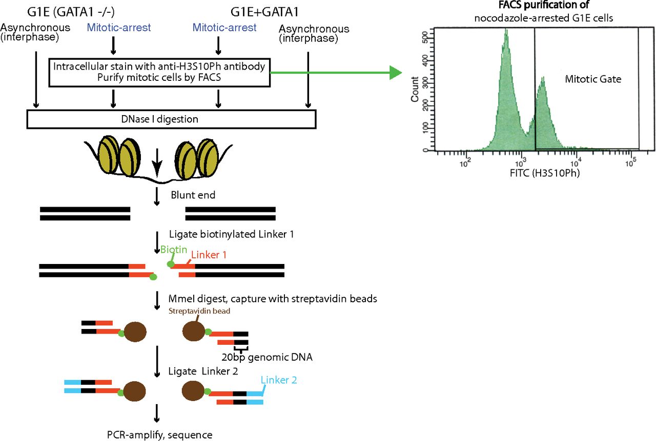 Experimental strategy for performing DNase-seq. G1E and G1E + GATA1 cells were grown asynchronously or arrested in mitosis by nocodazole treatment. Mitotic populations of nocodazole-treated cells were isolated by FACS using intracellular antibody staining of H3S10Ph. All samples were subjected to DNase digestion, followed by affinity capture of cleaved fragments, library preparation, and sequencing.