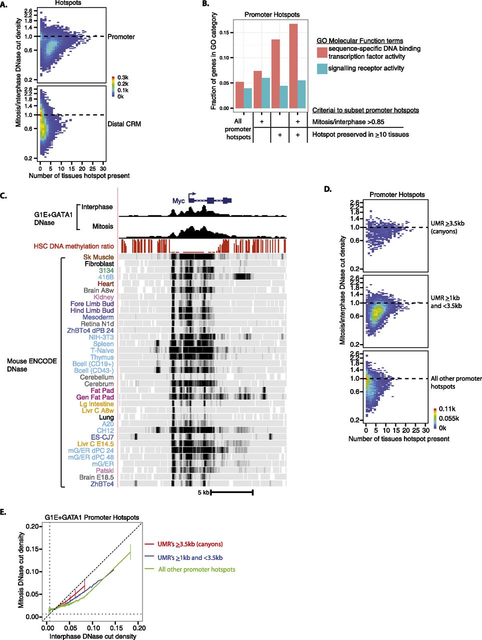 Promoters that are accessible across many murine tissues are marked by high mitotic accessibility and large DNA hypomethylation domains. (A) Promoter and distal CRM hotspots in G1E + GATA1 are shown in scatterplots (binned 2D density plot) of mitosis-to-interphase accessibility ratio versus the number of murine tissues in which the promoter hotspot overlaps at least one DNase hypersensitive site (DHS). Dashed horizontal line marks where mitotic and interphase DNase sensitivities are equal. (B) The fraction of promoter hotspots at genes encoding for sequence-specific transcription factor genes is specifically enriched by applying each of the two criteria (mitosis-to-interphase accessibility ratio and tissue preservation of hotspot) individually and together. (C) Myc is an example of a locus demarcated by a DNA methylation canyon. Shown are interphase and mitotic DNase accessibility profiles from G1E + GATA1, DNA methylation ratios in mouse HSCs, and DNase accessibility profiles from across Mouse ENCODE cell or tissue types, with dark bands representing DNase-sensitive regions. (D) G1E + GATA1 promoter hotspots are shown in scatterplots (binned 2D density plot) of mitosis-to-interphase accessibility ratio versus the number of murine cell or tissue (out of 45) DHS that is present. The panels are divided into promoter hotspots that overlap UMRs of the indicated size ranges. (E) Mitosis versus interphase DNase read densities of G1E + GATA1 promoter hotspots are shown as moving means color-coded by overlap with UMRs of the indicated size ranges, with error bars denoting SEM from biological replicates (n = 3). Error bars for the UMRs ≥1 kb and <3.5 kb (blue line) are omitted to avoid obscuring the difference between the red and green curves.