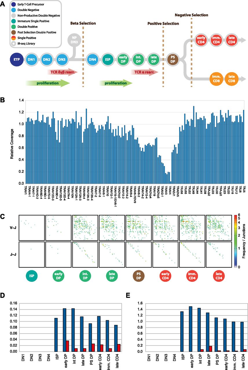IR-seq analysis of T cell developmental stages confirms that Jα-Jα ECs originate during alpha chain rearrangement. (A) Schematic diagram of T cell development showing stage-specific, thymus-derived cell sorts used to generate 12 IR-seq libraries (see Methods). (B) Coverage in the intermediate CD4 single positive (ISP) IR-seq library across the Tcra locus. Coverage was computed between neighboring Vα, Dα, and Jα gene segment RSSs and normalized relative to coverage in the same regions in the prerecombinational DN1 IR-seq data set. Depleted coverage across the Tcr delta locus is predicted to result from genomic excision events and loss of delta ECs during preceding proliferative phases. Coverage across the Jα subregion remains at ∼1, indicating that Jα-Jα ECs are not overrepresented in IR-seq. (C) Heatmap analyses of sorted T cell precursors showing Vα-Jα EC events (top) and Jα-Jα EC events (bottom) for eight consecutive recombinationally active IR-seq libraries. (D) Jα-Jα–to–Vα-Jα (blue bars) and Vα-Vα–to–Vα-Jα (red bars) ratios of RFs in 12 IR-seq libraries, representing key stages of T cell development. (E) DP-to-RF ratios for Vα-Jα (blue bars) and Jα-Jα (red bars) in 12 IR-seq libraries representing key stages of T cell development.