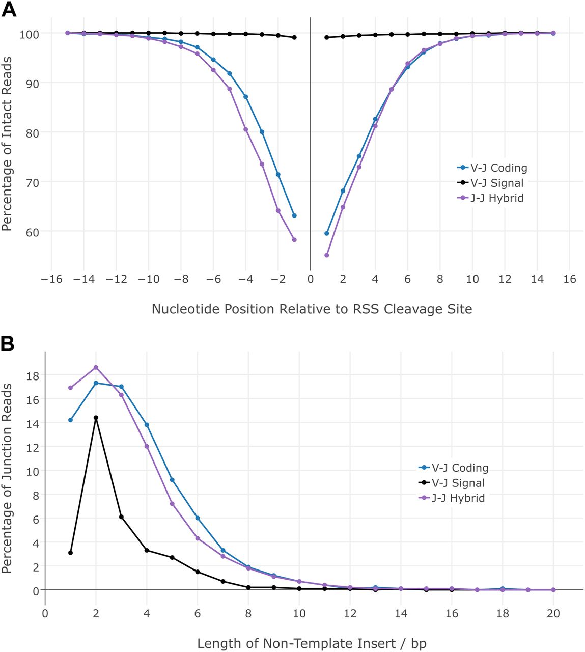 Analysis of Vα-Jα coding, Vα-Jα signal, and Jα-Jα hybrid junctions shows that Jα-Jα hybrids have processing characteristics similar to Vα-Jα coding junctions. (A) Frequency of nucleotide deletions flanking the RSS site of cleavage in coding Vα-Jα junctions (blue line), signal Vα-Jα junctions (black line), and hybrid Jα-Jα junctions (purple line). (B) Length of nontemplated bases in coding Vα-Jα junctions (blue line), signal Vα-Jα junctions (black line), and hybrid Jα-Jα junctions (purple line).