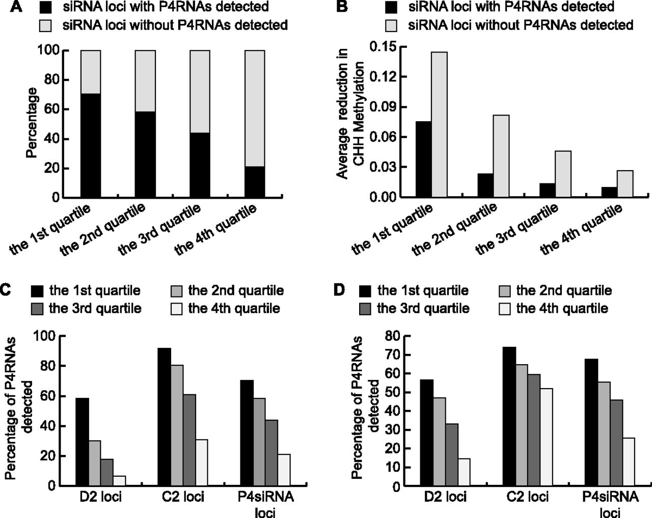 Decreased CHH DNA methylation in dcl234 compromises Pol IV transcription. (A–C) P4siRNA loci are divided into four quartiles according to P4siRNA abundance in WT, with the first quartile containing loci with the highest levels of P4siRNAs. (A) The percentage of P4siRNA loci with and without P4RNAs detected in our dsRNA-seq for the four quartiles. (B) The levels of CHH methylation decrease in dcl234 compared to WT for the four quartiles of P4siRNA loci with and without precursors detected. The decrease in CHH methylation was calculated using published methylome data (Stroud et al. 2013). (C) The percentage of P4RNAs detected at D2 and C2 siRNA loci for the four quartiles. Included in the analysis were 13,479 D2; 19,039 C2; and 47,742 total P4siRNA loci. (D) Correlation between P4RNA discovery and levels of CHH methylation at the siRNA loci. D2 and C2 siRNA loci are divided into four quartiles according to their CHH methylation levels in dcl234. The percentage of loci with P4RNAs detected in each quartile is shown. As CHH methylation levels decrease, the success rate of P4RNA discovery also decreases in total P4siRNA loci. In terms of P4RNA discovery, D2 loci are more sensitive to levels of CHH methylation.