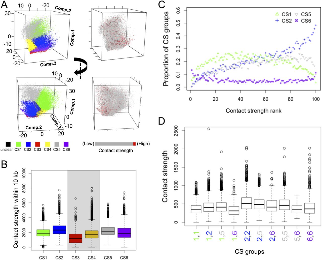 Epigenetic marks and contact strength. (A) Comparison of CS and contact strength across 2-kb bins graphed according to the first three principal components for epigenetic marks (similar to Fig. 2C). Contact strength is the sum of contacts of a 2-kb bin with the 10 surrounding bins. “Unclear” indicates no enrichment for any epigenetic mark. (B) Contact strengths of bins according to CS classification. CS3 and CS4 are shaded, as their sequences display biases that might result in lower contact strength values. (C) CS classification of bins ranked by contact strength, from low to high. (D) Contact strength of adjacent bins. In C,D, due to biases, data regarding CS3 and CS4 are not shown, but they are presented in Supplemental Figure 12. In B–D, the few bins of unclear categorization are not shown.