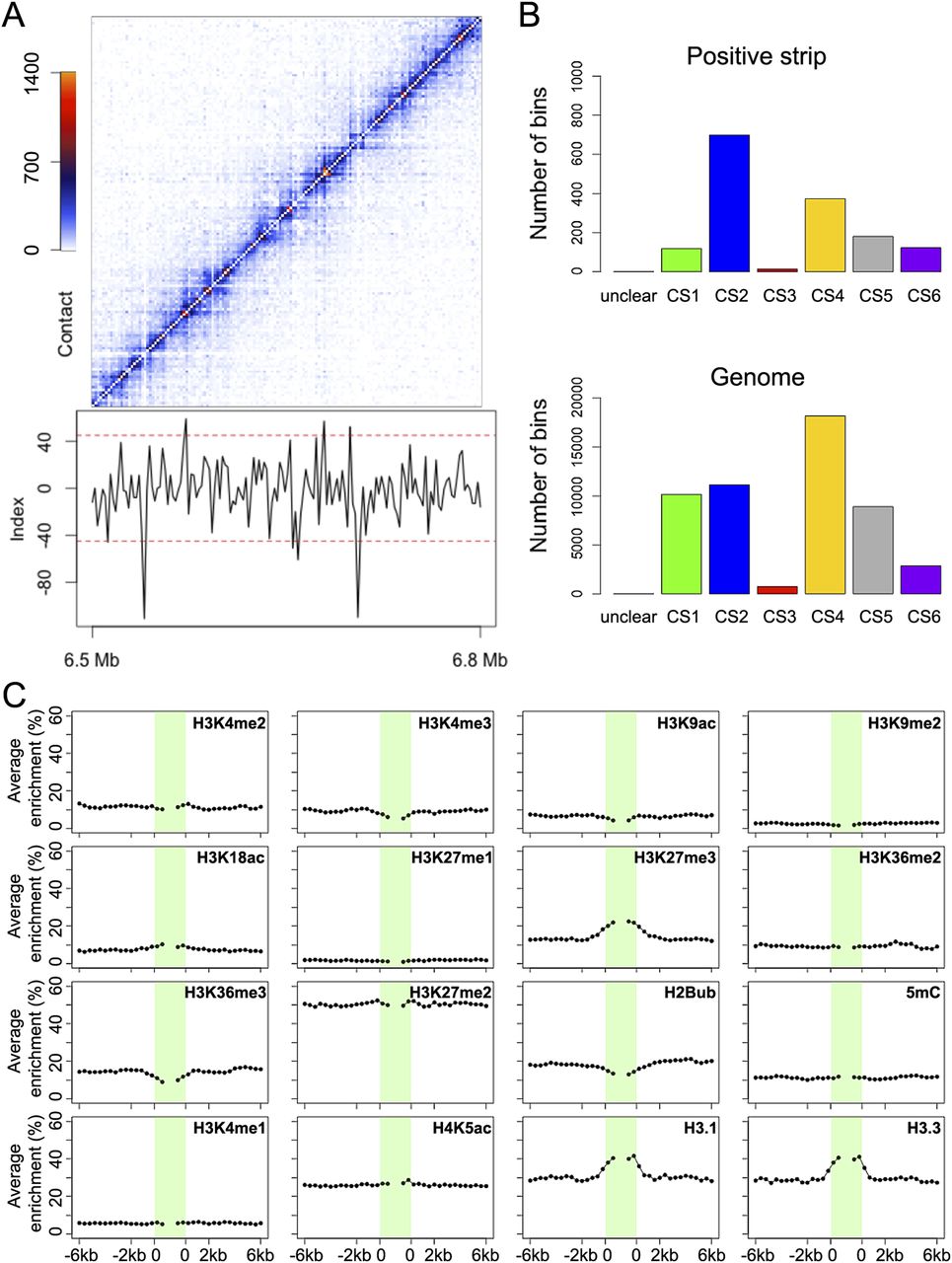 Genomic features associated with local strips. (A) Hi-C map of a genomic region from Chromosome 1. Index used to quantify local contrast is plotted below. Red dashed lines depict thresholds for calling strips. (B) Annotation of bins forming positive strips by CS. (C) Epigenetic marks around positive strips. Average enrichment means the percentage of each 400-bp region claimed as enriched for the respective epigenetic mark.