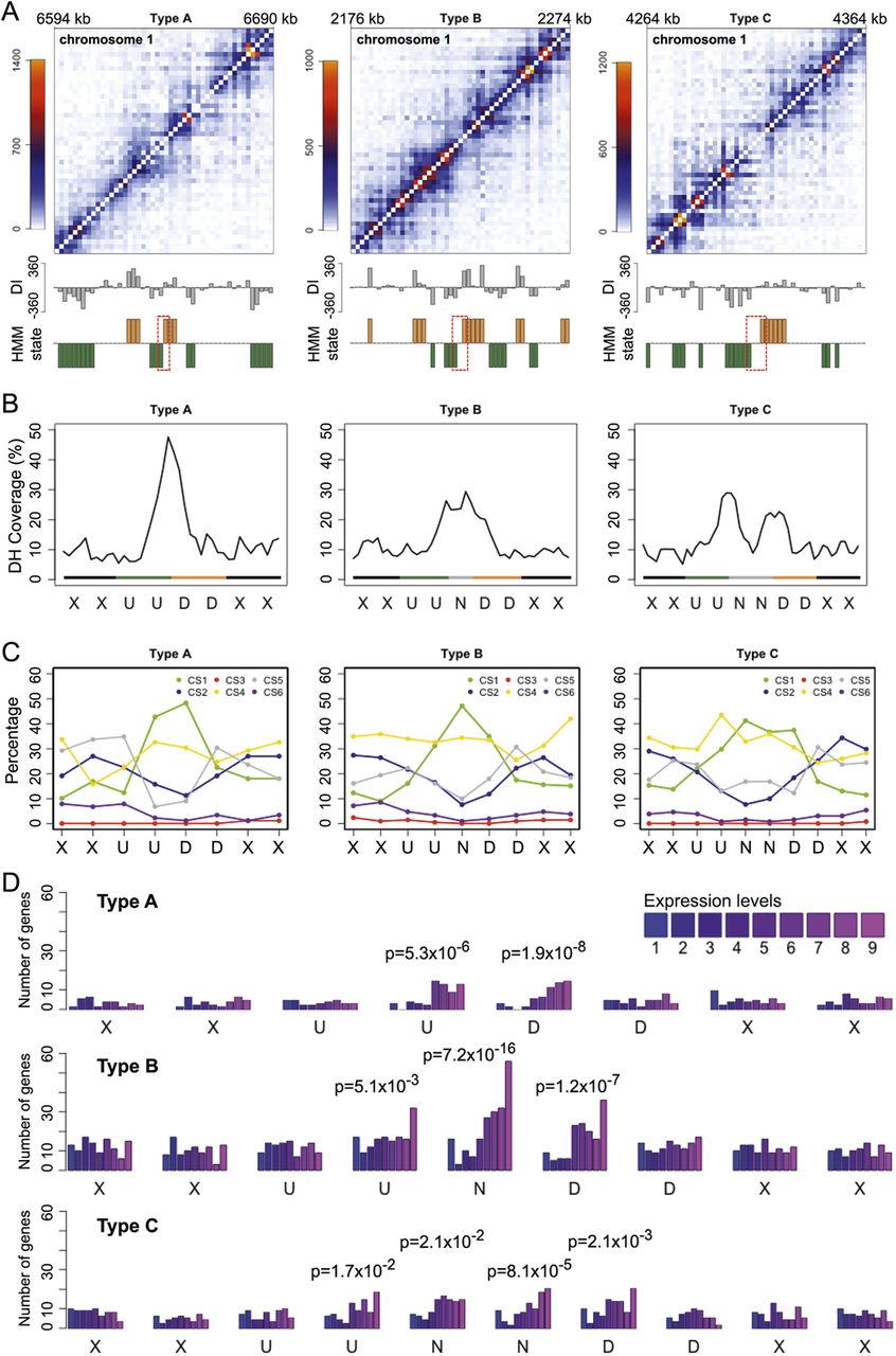 Insulator-like regions in the A. thaliana genome. (A) Examples of each type of insulator-like region, which are placed at the center of the Hi-C map details. Directionality index (DI) and HMM state are shown at the bottom. Positive and negative DI values indicate bins with stronger-than-expected interactions with downstream and upstream regions. Orange indicates downstream and green upstream bias, and the dashed boxes insulator-like regions. (B) DNase I hypersensitive sites (DH) around insulator-like regions. Coverage means the average percentage of each 500-bp bin annotated with such a feature. “U” and “D” bins have biased interactions with upstream and downstream regions, while “N” bins have no directionality bias. “X” indicates bins with any type of HMM state. (C) CS annotation of bins around insulator-like regions. (D) Distribution of genes by expression level around insulator-like regions. For bins from insulator-like regions, the P-values indicate the significance of change in expression level distribution from Cramér-von Mises tests. For C and D, the HMM state of bins are labeled as in B. See Supplemental Figure 18B for categorization of expression levels.