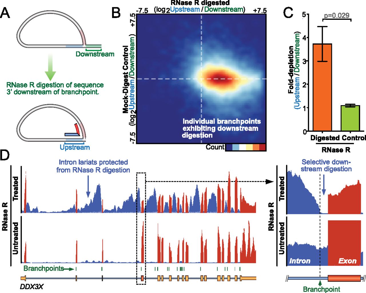 RNase R digestion of intron lariats. (A) Schematic showing digestion of the lariat tail (green) downstream from the branchpoint by RNase R, while the closed lariat protects sequences upstream of the branchpoint (blue). (B) Heatmap indicates the relative enrichment of sequences upstream of individual branchpoints within RNase R digested libraries (x-axis) compared to untreated control (y-axis) libraries. The majority of branchpoints show enrichment of upstream sequences after digestion (indicated by positive horizontal spread), whereas the clustering at zero on the y-axis indicates that sequences around individual branchpoints show no enrichment in mock-digested libraries. (C) Histogram indicates significant depletion of intronic sequences downstream from branchpoints (to the 3′SS) relative to the upstream region following RNase R digestion. Two human cell types, each with two biological replicates with matched untreated controls (paired t-test, n = 4, error bars SEM). (D) Genome Browser view showing enrichment of DDX3X intron lariats following RNase R digestion. Close detail indicates selective digestion of intronic sequence downstream from the identified branchpoint. In contrast, equivalent pre-mRNA is observed both up- and downstream from branchpoints in untreated libraries.