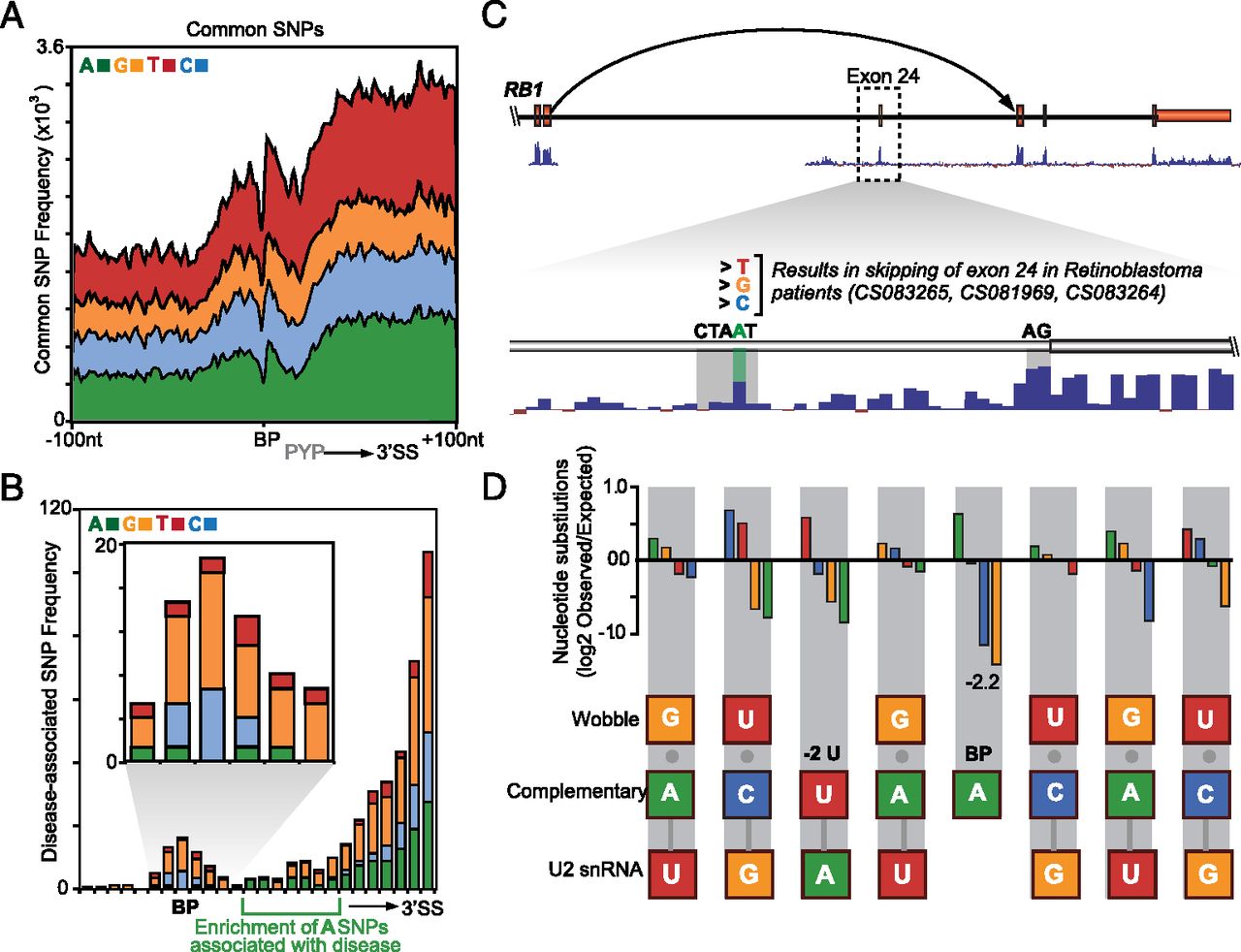 Common and disease-associated genetic variation at branchpoints. (A) Frequency distribution of common SNPs across a 200-nt window shows that branchpoints are refractory to common genetic variation (note that downstream exon enrichment is confounded by SNP ascertainment bias). (B) Frequency distribution of disease-associated SNPs (with inset showing detail) indicates enrichment at branchpoint. (C) UCSC Genome Browser view of nucleotide identified as a branchpoint (A; green) in the Retinoblastoma gene (RB1). Mutations at this nucleotide have been associated with exon 24 skipping (dashed arrow) in retinoblastoma patients (Houdayer et al. 2008; Zhang et al. 2008). High conservation (Vertebrate 46way) of branchpoint indicated by lower blue histogram. (D) Histogram indicates fold enrichment for nucleotide substitutions (SNPs) between individual human genomes. Fold enrichment indicates the observed rate of SNPs relative to the expected genome background rate of nucleotide substitution. This demonstrates enrichment for SNPs that maintain complementary or wobble binding between the B-box and U2 snRNA. U2 snRNA and B-box base-pairing nucleotide possibilities are indicated in the lower schematic.