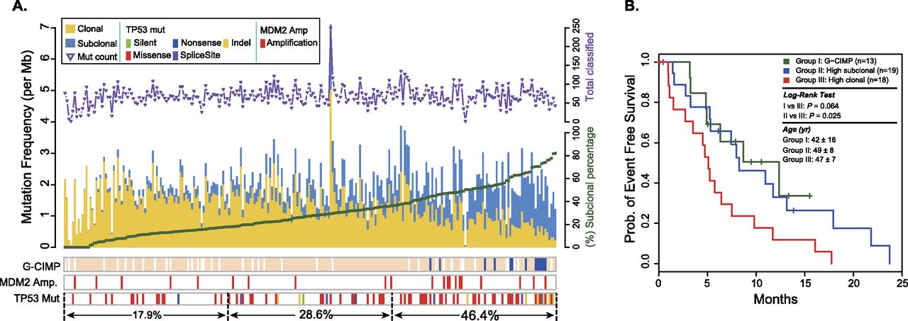 Association of subclonal fraction with TP53 mutation and event-free survival. (A) Clonal (yellow) and subclonal (blue) mutation frequencies and their association with G-CIMP methylation phenotype (blue) and p53 pathway-related alterations. The total number of sSNVs per patient is indicated in the top panel. (B) Patients with non-G-CIMP GBM harboring a higher subclonal mutation frequency (top 30% of non-G-CIMPs; Group II; blue) exhibited a longer event-free survival time compared to non-G-CIMP patients, whose tumor cell mutations had higher clonal frequency (bottom 30% of non-G-CIMPs; Group III; red). G-CIMP cases are grouped separately into Group I (dark green) and show event-free survival similar to that of Group II. Only patients younger than 55 yr of age were included in Groups II and III, and all G-CIMP cases were included in Group I.