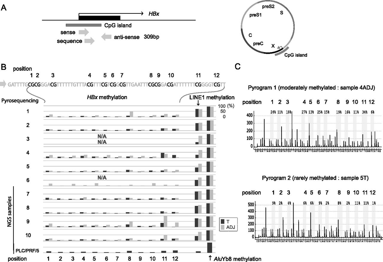 Methylation analysis of the CGI of the HBx gene. (A) Schema of the CGI of the HBx gene. Three arrows show the pyrosequencing primers used for the methylation analysis. (B) DNA methylation levels of the CpGs of the HBx gene, LINE1, and AluYb8 in 10 paired HBV-HCC and adjacent nontumor tissue samples and PLC/PRF/5 DNA were analyzed using bisulfite pyrosequencing. Methylation levels of HBx varied across samples and were generally lower in HCC tissues than in the adjacent nontumor tissues. An association between HBx methylation levels and those of the LINE1 and AluYb8 repeats was not observed. N/A, could not be analyzed. DNAs from four paired HBV-HCC and adjacent nontumor tissue samples (sample nos. 7–10), PLC/PRF5, and HepG2.2.15 were further analyzed using the NGS (G-NaVI method). (C) Representative pyrograms showing DNA methylation levels of the CpGs of the HBx gene. Methylation levels at 12 CpG sites of the HBx gene in adjacent nontumor tissue (sample no. 4ADJ) and tumor tissue (sample no. 5T) are shown.
