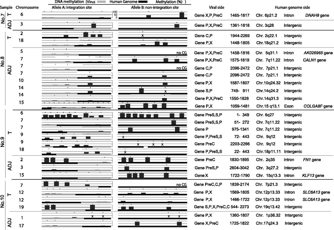 Allele-specific methylation analysis of the tumor (T) and adjacent nontumor (ADJ) sample genomes. The methylation levels of the HBV and human genomes for the integrated and unintegrated alleles in four paired tumor and adjacent nontumor samples (sample nos. 7–10) are shown. Detailed results of the HBV integrants (PreC, Precore; C, Core; PreS, Presurface; S, Surface; X, X) and flanking host genomes (position, chromosome, location of the genome, and gene names) are shown. The HBV genome became significantly methylated when integrated into highly methylated human genome regions, but not when integrated into unmethylated human genome regions. (×) The desired quantitative methylation levels were not obtained because of technical difficulties with the sequences that were being analyzed.