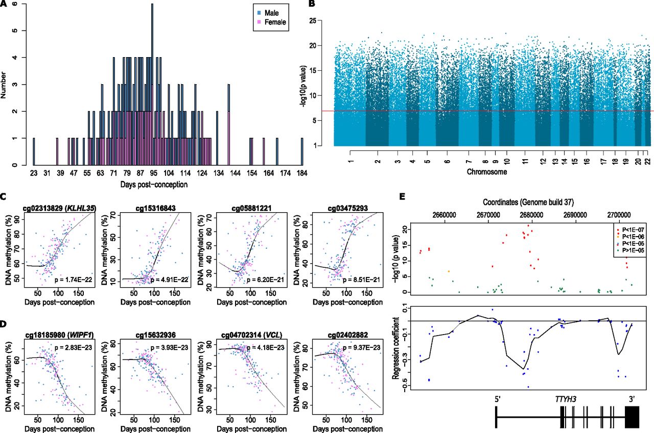 DNA methylation changes during human brain development are widespread across the genome. (A) Overview of the 179 human fetal brain samples (100 male, 79 female) spanning 23 to 184 DPC profiled in this study. (B) Manhattan plot showing the widespread distribution of Bonferroni-significant fetal brain dDMPs (P-value corresponds to association with age). (C) The four top-ranked dDMPs showing increased DNA methylation with fetal age (hypermethylated dDMPs). DNA methylation (%) is plotted against DPC. Females are shown in pink, males in blue. (D) The four top-ranked dDMPs showing decreased DNA methylation with fetal age (hypomethylated dDMPs). DNA methylation (%) is plotted against DPC. Females are shown in pink, males in blue. (E) Many loci are characterized by regions of extended differential DNA methylation associated with fetal brain development. Shown is the TTYH3 gene that contains three discrete differentially methylated regions (DMRs), which become hypomethylated during fetal brain development. The top panel depicts the association statistic for individual probes, with color corresponding to significance. The bottom panel depicts the regression coefficient between DNA methylation and brain development for individual probes, with a line of best-fit highlighting three domains characterized by hypomethylation across brain development.