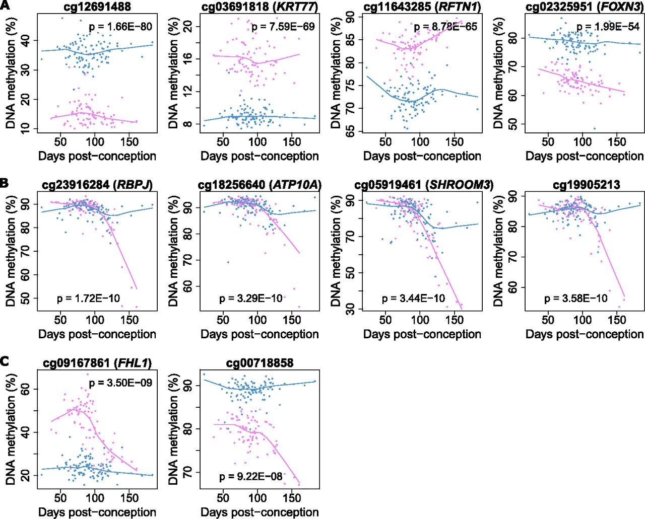 Sex-specific DNA methylation differences in the developing fetal brain. A total of 8059 (1.99% of the 408,594 autosomal and X-linked probes assessed) were identified as significantly differentially methylated between males and females in the fetal brain, with most differences occurring on the X Chromosome as expected. However, a number of autosomal loci also show significant differences between males and females, as illustrated by the four probes shown in A. Of note, DNA methylation at a number of (B) autosomal and (C) X Chromosome probes showed significant interactions between sex and developmental stage, indicating differential trajectories of DNA methylation in the developing male and female brain.