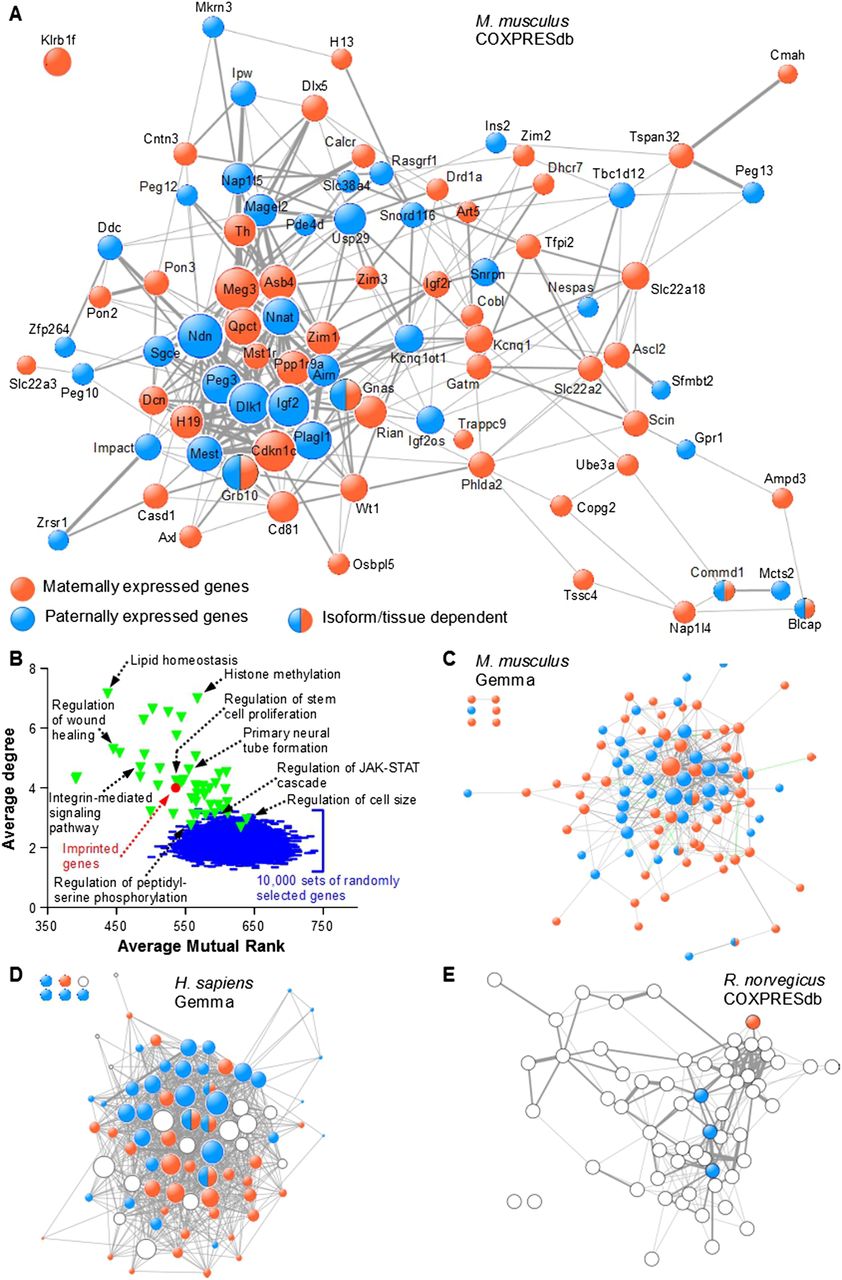 Imprinted genes are frequently coexpressed. (A) The COXPRESdb meta-analysis of microarray data was searched for coexpression among murine IGs. The resulting coexpression links are represented using Cytoscape. Node size is proportional to node degree. Edge width represents the mutual rank (see Supplemental Information) between two given nodes. (B) The average degree and average mutual rank were computed for the network of 85 IGs displayed in A (red circle). Random networks (blue lines) were generated by randomly drawing 10,000 sets of 85 Gene IDs with data in COXPRESdb and retrieving coexpression links as for the 85 murine IGs. A similar procedure was performed with 50 sets of 85 genes found in GO Biological Processes (green triangles) and with data in COXPRESdb (for a full list of the GO BPs analyzed, see Supplemental Table S22). (C) The Gemma meta-analysis of microarray data was searched for coexpression among murine IGs. Node size is proportional to node degree. Edge width maps the number of data sets in which two given nodes are coexpressed. (D) The Gemma database was searched for coexpression among human IGs and orthologs of murine IGs whose imprinting status in humans is unknown or uncertain (open circles) as in C. (E) The COXPRESdb was searched for coexpression of rat IGs and orthologs of murine IGs whose imprinting status in rat is unknown (open circles) as in A.