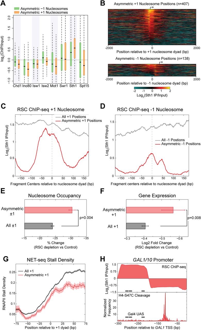 Asymmetric nucleosomes are stabilized by RSC. (A) ChIP enrichment of chromatin remodelers and Spt15 over the dyad axis ±70 bp of asymmetric +1 and −1 nucleosome positions is shown as box-plots. (B) Heatmap of the log2 enrichment of the RSC catalytic subunit, Sth1 over input, plotted relative to the dyad axis of asymmetric +1 nucleosome positions (top) and asymmetric −1 nucleosome positions (bottom). (C) ChIP-seq of the RSC catalytic subunit, Sth1, shows enrichment of RSC specifically over the nucleosome at asymmetric +1 positions compared to enrichment at the upstream NDR for all +1 positions. Log enrichment of the normalized density of fragment centers is plotted. The fragment centers were obtained from paired-end sequencing data and correspond to fragments of length 200 ± 20 bp. Data are averaged over a 20-bp moving window. (D) Same as C for asymmetric −1 nucleosome positions. (E) Depletion of the RSC component Sth1 results in a significantly greater decrease in nucleosome occupancy at asymmetric ±1 positions compared to all ±1 positions. P = 0.004 (Kolmogorov-Smirnov test). (F) Depletion of the RSC component Sth1 results in a significantly greater decrease in the expression of well-expressed genes with asymmetric +1 nucleosome position compared to all well-expressed genes with a +1 nucleosome position. P = 0.008 (Kolmogorov-Smirnov test). For E and F, mean and SEM are plotted. (G) Well-expressed genes with asymmetric +1 nucleosome positions feature decreased stalling by RNA polymerase II at the +1 nucleosome compared to well-expressed genes with a +1 nucleosome position. (H) (Top) Plot showing the log2 enrichment of Sth1 ChIP-seq at the GAL1/10 promoter, for fragment lengths between 120 and 160 bp, with the Gal4 binding sites indicated with gray bars. (Bottom) H4-S47C cleavage frequency is plotted for the GAL1/10 promoter, showing a highly asymmetric nucleosome position downstream from the Gal4 binding sites. The dyad position of the asymmetric nucleosome is indicated with a dashed black line, showing that the frequency of cleavages is higher upstream of the dyad.