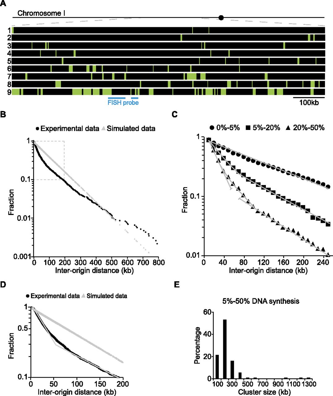 Replication origins both fire stochastically and form clusters. (A) Replication profile of nine completely overlapping 1-Mb single DNA molecules corresponding to the same region on Chromosome I (from 2100 to 3100 kb). (B) Semilog plot of the cumulative frequency of IODs measured for 131 single DNA molecules with an average length of 1.8 Mb and replicated up to 50% (black curve). The values on the y-axis correspond to the fraction of IODs that are larger in size than the corresponding IOD on the x-axis. The gray line corresponds to simulated data for a purely random distribution of the same number of origins over the same DNA length. The experimental measurements deviate significantly from the purely stochastic prediction, P < 0.001 (Lilliefors statistical test). (C) Semilog plot of the cumulative frequencies of IODs for molecules sampled according to their extent of DNA synthesis; black circles, black squares, and black triangles correspond to molecules replicated from 0%–5%, 5%–20%, and 20%–50%, respectively. At the beginning of S-phase, origin selection is random, as the cumulative frequency of IODs for molecules replicated up to 5% fits a straight line. For molecules replicated from 5%–20%, the curve deviates from the straight line at short IODs. The curve corresponding to molecules replicated from 20% to 50% can be decomposed into two straight lines with different slopes. (D) Semilog plot of the data within the dashed box in B, representing 90% of the IODs. The experimental data curve can be decomposed into two straight lines with different slopes (thin gray line), indicative of two regimes of stochastic origin selection operating along chromosomes. (E) Histogram of cluster sizes for molecules replicated from 5% to 50%.