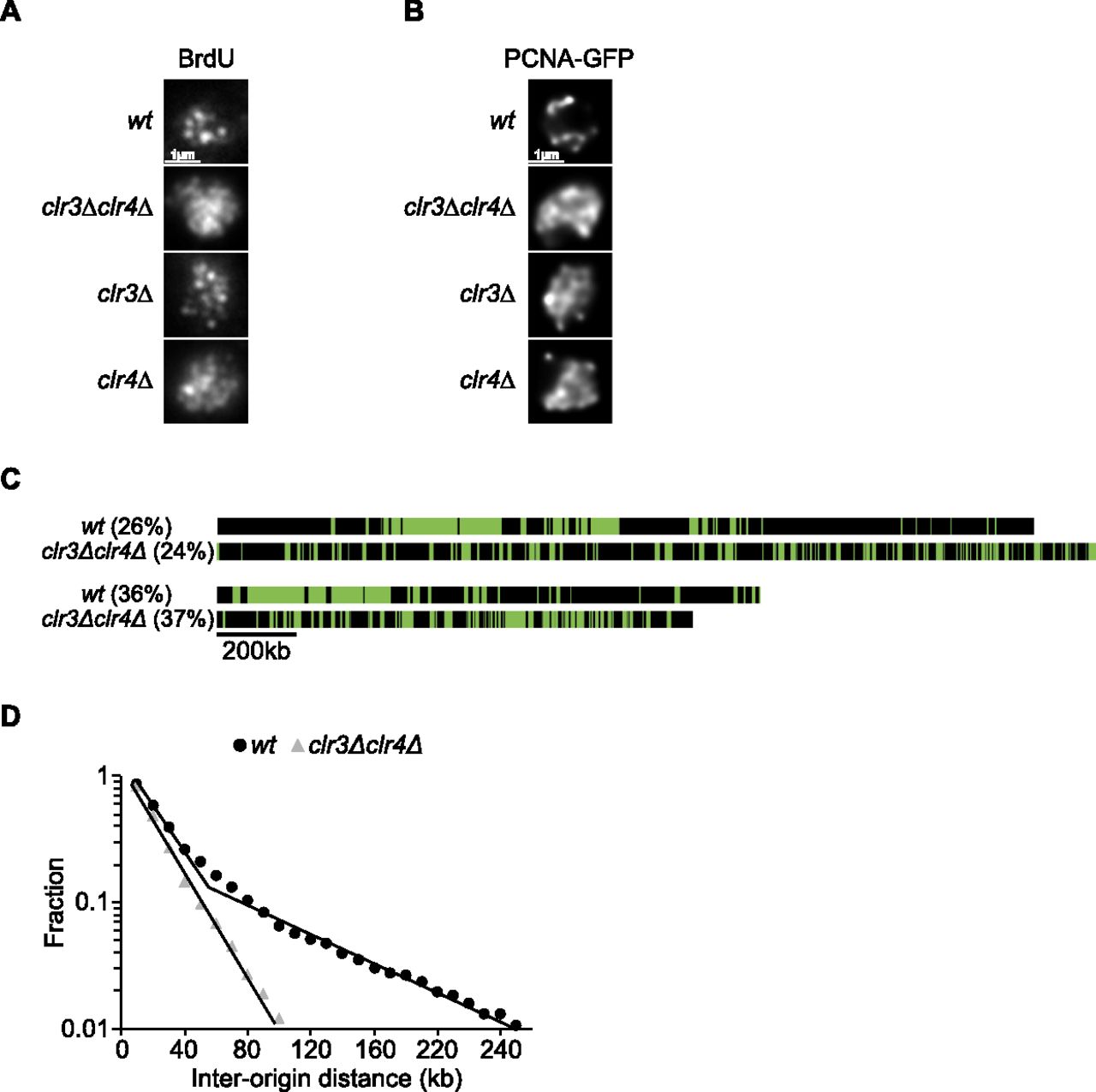 A clr3∆clr4∆ mutant disrupts both the organization of replication foci within the nucleus and clusters with fired origins along the chromosomes. (A) Immunostaining of BrdU-labeled replication foci in wt, clr3∆, clr4∆, and clr3∆clr4∆ cells. Images show an equatorial optical section. (B) Live imaging of PCNA-GFP-labeled replication foci. Images show an equatorial optical section. (C) Comparison between wt and clr3∆clr4∆ molecules at the same percentage of DNA replication. Clusters are present in wt molecules but are not observed in clr3∆clr4∆ molecules. (D) Semilog plot of the cumulative frequencies of IODs for molecules replicated from 20% to 50% for wt and clr3∆clr4∆ cells. The values on the y-axis correspond to the fraction of IODs that are larger in size than the corresponding IOD on the x-axis. The data points for clr3∆clr4∆ cells are fitted with a single straight line. The second straight line with the shallow slope described for wt cells is not present in clr3∆clr4∆ cells.