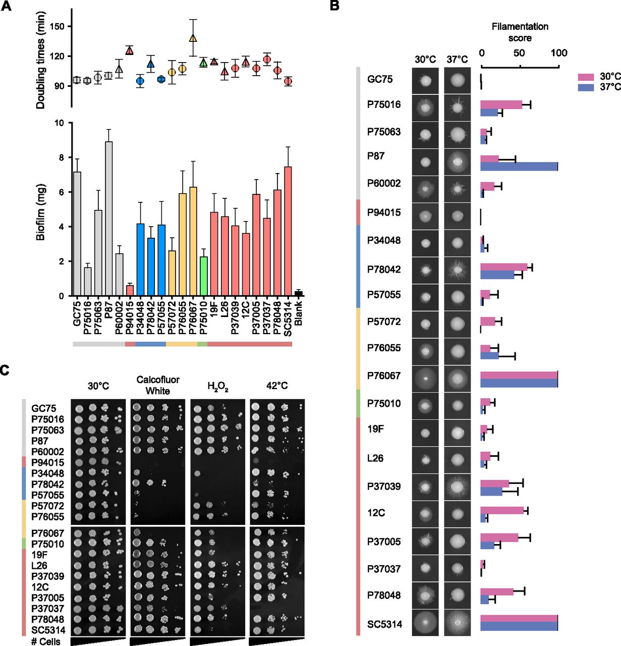 Phenotypic profiling of C. albicans isolates. (A) Doubling times and biofilm formation. Doubling times were measured in liquid YPD medium at 30°C. Circles represent euploid isolates and triangles represent aneuploid isolates. Biofilm dryweight biomasses ± standard error. Colors represent clade designation as follows: (SA) gray; (I) red; (II) yellow; (III) blue; (E) green. (B) Filamentation of clinical isolates grown on Spider medium for 7 d at 30°C or 37°C. Bar graphs represent filamentation scores ± standard error for strains at 30°C (pink) or 37°C (blue). (C) Assays of clinical isolates grown in the presence of stressors. Tenfold dilutions of cells were plated under regular growth conditions (SCD, 30°C), cell wall stress (SCD + 100 µg/mL calcofluor white, 30°C), oxidative stress (SCD + 2 mM hydrogen peroxide, 30°C), and thermal stress (SCD medium, 42°C).