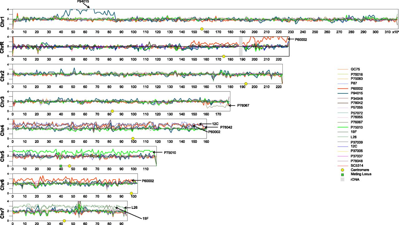 Aneuploid regions of clinical isolates. For each sequenced isolate, normalized read depth in 1-kb windows is shown along each chromosome relative to the SC5314 reference. Chromosome position is shown for every 100 kb along the x-axis; average normalized depth on the y-axis is relative to diploid levels. Regions exhibiting partial or full chromosome aneuploidies are noted with the corresponding isolate name. See also Supplemental Figure S8 for chromosome copy number in each strain.