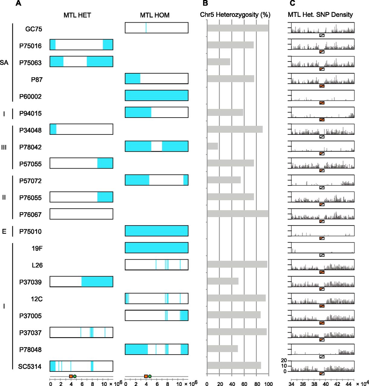 Pattern of heterozygosity on Chromosome 5 containing the MTL locus. (A) Isolates were typed as either MTL heterozygous (left column) or MTL homozygous (right column). Homozygous regions (shaded blue) of Chromosome 5 were identified from SNP data. The lower axis indicates the position of the MTL locus (orange rectangle) and centromere (green circle) on Chromosome 5, with scale shown in bases. (B) Percentage of Chromosome 5 that is heterozygous in each isolate (fraction of 5-kb windows typed as heterozygous; see Methods). (C) Pattern of SNP heterozygosity immediately flanking the MTL locus. Note that SNPs within the MTL loci were not mapped due to the high sequence divergence of the two loci. MTLa loci are marked by orange triangles and MTLα loci are marked by white triangles. Axis indicates position on Chromosome 5, with scale shown in bases.
