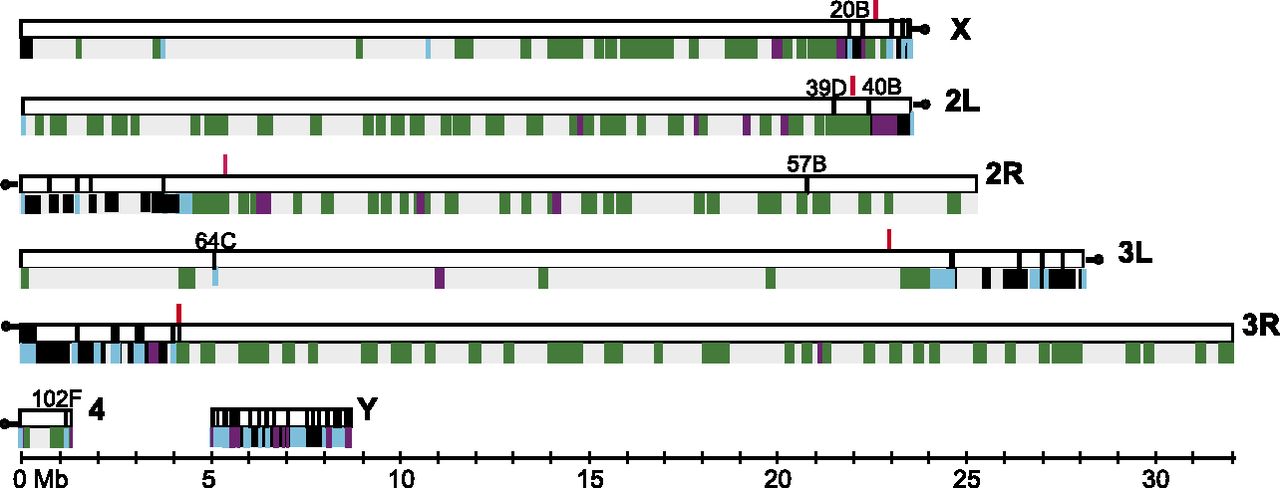 The Release 6 chromosome arm sequences. Schematic representation of the Release 6 chromosome arm sequences (horizontal white bars). The boundary between euchromatin and pericentric heterochromatin on each arm (Riddle et al. 2011) is indicated (red vertical lines). Clone gaps between sequence scaffolds (vertical black lines) are labeled with their cytogenetic locations on the polytene chromosome map. (Below) Color-coding indicates the sequence release at which each BAC-based sequence was finalized: Release 3 (gray), Release 4 (green), Release 5 (purple), Release 6 (black). Sequences finished in WGS3-based scaffolds are indicated (blue).