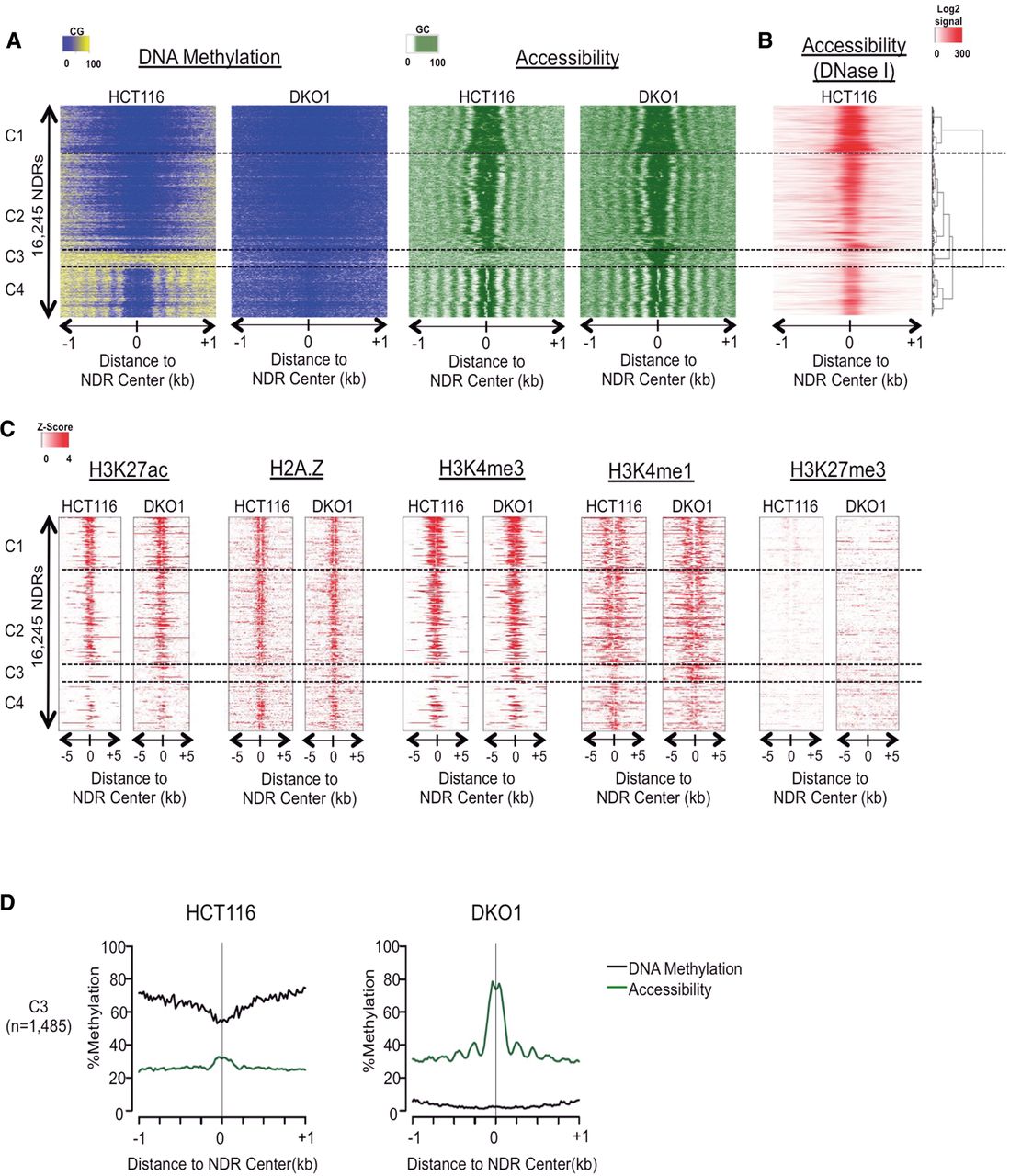 NOMe-seq detects nucleosome depletion at a subset of genomic enhancers in methyltransferase-deficient DKO1 cells. (A) Our hidden Markov model (HMM) identified all methyltransferase accessible regions (MARs), and those longer than 100 bp were considered nucleosome-depleted regions (NDRs). The heatmap includes all NDRs that were overlapping between the two biological replicates of either HCT116 and DKO1 cells (n = 16,245). NOMe-seq methylation levels (CG methylation for “DNA Methylation” and GC methylation for “Accessibility”) were aligned based on the center of the NDR and extended by ±1 kb. NDRs were hierarchically clustered based on the accessibility within ±250 bp of NDR centers in both cell types, and dashed horizontal lines separate the four top-level clusters. (B) ENCODE DNase hypersensitivity signal intensity is plotted for HCT116 cells for the same genomic regions in A. (C) Enrichment level for each histone mark was calculated as Z-score against the genomic background, and the value was plotted ±5 kb from the center of the NDRs for the same regions in A. (D) Average methylation (black) and accessibility (green) levels are shown for the altered cluster C3 (plots for the invariant clusters C1, C2, and C4 are shown in Supplemental Fig. 1D.)