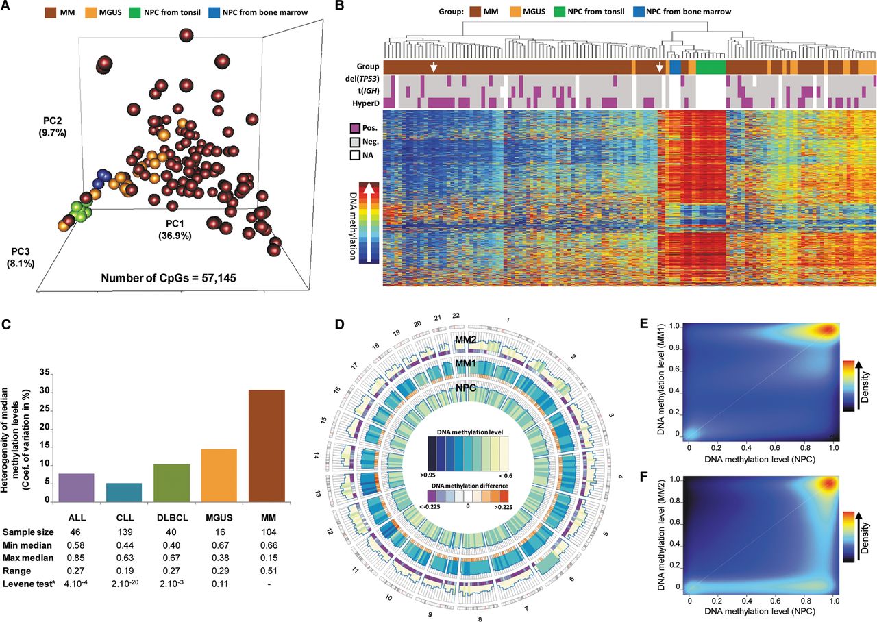 Whole-genome DNA methylation data of neoplastic and normal plasma cells. (A) Principal component analysis of HumanMethylation450 BeadChip data in MGUS, MM, and NPC from tonsils or bone marrow. (B) Unsupervised hierarchical clustering analysis of MM and MGUS patient samples as well as NPC samples from tonsil or bone marrow from healthy donors (the 20,000 CpG sites with most variable methylation values were used for this analysis). (HyperD) Hyperdiploid MM sample; [t(IGH)] MM sample with IGH translocation; [del(TP53)] MM sample with deletion of TP53. (C) Bar plot showing the coefficient of variation of median methylation values per case in ALL, CLL, DLBCL, MGUS, and MM. (D) Circular representation of DNA methylation levels of purified plasma cells of two MM patient samples (MM1 and MM2) compared to purified NPC obtained from bone marrow from healthy donors. Histograms represent CpG methylation levels averaged in 10-Mbp genomic windows. This representation with low resolution indicates that the shift of methylation levels in MM1 and MM2, as compared to NPCs, takes place throughout the genome and not only in particular chromosomal regions. (E,F) Scatter plots and density color codes for DNA methylation data of all autosomes. Pairwise comparisons of MM1 sample to NPC (E) and MM2 sample to NPC (F) are shown.