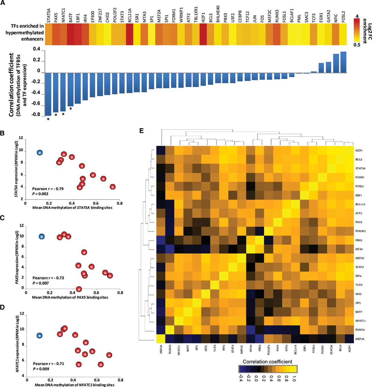 B cell-specific TFs' expression correlates with DNA methylation levels of their binding sites in MM. (A) The upper part shows that hypermethylated enhancers are enriched for binding sites of B cell-specific TFs. The lower part displays the correlation coefficients between TF expression and mean DNA methylation level of their respective binding sites with hypermethylation in MM. (*) P < 0.05. (B–D) Scatter plots showing the association between TF expression and mean methylation level of their respective binding sites. Normal plasma cells are shown in blue and multiple myeloma samples are depicted in red. (E) Correlation matrix of expression levels of TFs among the 11 MM cases with available RNA-seq data. Only those TFs from A with at least 1.5-fold enrichment (in log2) were used for this analysis.