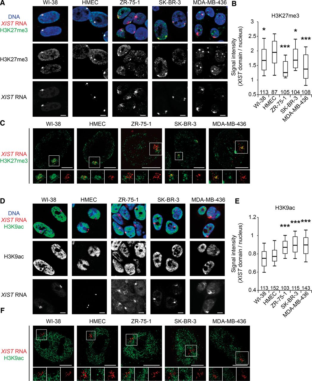 H3K27me3 and H3K9ac profiles associated with XIST-coated X chromosomes are impaired in breast cancer cell lines. (A) Z-projections of 3D immuno-RNA FISH show representative examples of the level of H3K27me3 enrichment (green) on XIST RNA domains (red) in normal (WI-38 and HMEC) and breast cancer cell lines (ZR-75-1, SK-BR-3, and MDA-MB-436). NB: In MDA-MB-436, the highly H3K27me3 enriched bodies visible in each nucleus do not belong to the X chromosome (nor in metaphase [Fig. 3C] or in interphase [Supplemental Fig. S3F]). (B) Boxplot shows the levels of H3K27me3 enrichment on XIST domains relative to the rest of the nucleus. Numbers of analyzed nuclei are shown above the x-axis. For details on quantification method see Supplemental Figure S2A,B. (C) High-resolution immuno-RNA FISH shows representative examples of H3K27me3 enrichment (green) on XIST RNA domains (red) in normal and breast cancer cell lines. Insets for H3K27me3, XIST RNA, and merge are shown below each cell line. (D) Single section of 3D immuno-RNA FISH shows representative examples of the level of H3K9ac depletion (green) on XIST RNA domains (red) in normal and breast cancer cell lines. (E) Boxplot shows the levels of H3K9ac depletion on XIST domains relative to the rest of the nucleus. The numbers of analyzed nuclei are shown above the x-axis. For details on the quantification method, see Supplemental Figure S2A,C. (F) High-resolution immuno-RNA FISH shows representative examples of H3K9ac depletion (green) on XIST RNA domains (red) in normal and breast cancer cell lines. Insets for H3K9ac, XIST RNA, and merge are shown below each cell line. (Boxplots) Upper whisker represents 90%, upper quartile 75%, median 50%, lower quartile 25%, and lower whisker 10% of the data set for each cell line. (***) P < 0.001; (**) P < 0.01; (*) P < 0.05 using the Student's t-test. All data sets are compared with HMEC data set. Scale bar, 5 µm.