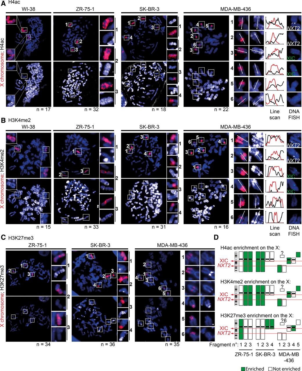 The inactive X chromosome is still epigenetically distinguishable from its active counterpart. (A) Representative examples of immunofluorescence show the status of H4ac (white) depletion/enrichment on X chromosomes (X-paint DNA FISH, red) on metaphase spreads from normal (WI-38) and breast cancer cell lines (ZR-75-1, SK-BR-3, and MDA-MB-436). On the right, MDA-MB-436 cells carry six X-chromosome fragments with a “2-by-2” homology, as assessed by the presence or absence of the NXT2 (white) or XIC loci (green), and line scans show H4ac enrichment variation between these X-fragments and the neighboring autosomal regions. As expected, one X chromosome (Xi) lacks H4ac staining in normal WI-38 cells (and HMEC, not shown). ZR-75-1 and SK-BR-3 cell lines harbor a reduced H4ac staining on one and two X chromosomes, respectively, in agreement with the number of XIST-coated X chromosomes shown in Figure 1A. In MDA-MB-436 cells, homologous X-chromosome fragments (two containing the XIC locus, two containing the NXT2 locus, and two with none of them) display opposite H4ac staining, suggesting that there is still one inactive and one active X chromosome linked to those loci, although fragmented. (B) Representative examples of immunofluorescence show the status of H3K4me2 (white) depletion/enrichment on X chromosomes (X-paint DNA FISH, red) on metaphase spreads from normal and breast cancer cell lines. On the right, line scans show H3K4me2 enrichment variation between the six X-fragments (for details, see A) and the neighboring autosomal regions in MDA-MB-436 cells. In each tumoral cell line, H3K4me2 depletion patterns follow the H4ac profiles found in A. (C) Representative examples of immunofluorescence show the status of H3K27me3 (white) enrichment on X chromosomes (X-paint DNA FISH, red) in metaphase spreads from breast cancer cell lines. ZR-75-1 and SK-BR-3 cell lines harbor an accumulation of H3K27me3 on one and two X chromosomes, respectively, in agreement with the number of XIST-coated X chromosomes shown in A. In MDA-MB-436 cells, H3K27me3 staining was only enriched on the X-chromosome fragment, where the XIC region lies. Indeed, RNA/DNA FISH analysis showed that this X fragment corresponds to the one coated by XIST RNA in interphase cells, which is not the case for the other fragments (Supplemental Fig. S3F). In SK-BR-3 and MDA-MB-436 cell lines, H3K27me3 spreads into the autosomal fragments translocated to the XIC-containing fragment. (D) Schematic view of H4ac, H3K4me2, and H3K27me3 patterns on X-chromosomes in the three tumor cell lines.