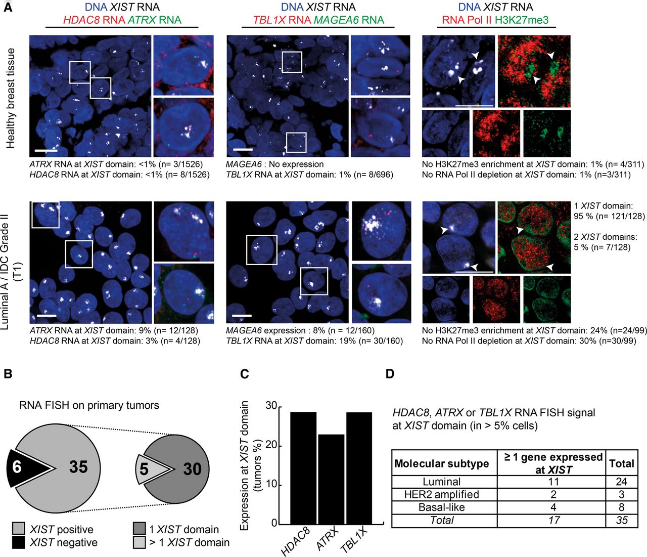 The inactive X chromosome is reactivated in primary breast tumors. (A) Z-projections of 3D RNA FISH show representative examples of expression of HDAC8 (red) and ATRX (green) (left) or TBL1X (red) and MAGEA6 (green) (middle) at XIST domains (gray) in healthy breast tissue and invasive ductal carcinoma (IDC; Luminal A Grade III tumor). On the right, Z-projections of super-resolutive 3D immuno-RNA FISH show representative examples of the level of H3K27me3 enrichment (green) and RNA Pol II depletion (red) on XIST RNA domains (gray) in healthy and tumoral breast tissues. Arrowheads indicate the XIST domains. Quantification of RNA Pol II exclusion and H3K27me3 enrichment at XIST domains have been carried out on images acquired with a confocal spinning-disk microscope. Scale bar, 10 µm. (B) Summary of the XIST domain positive (domains in >10% of the nuclei) and negative tumors among the 41 primary breast tumors studied. (C) Summary of the number of tumors harboring HDAC8, ATRX, or TBL1X expression at XIST domain (assessed by RNA FISH). A gene showing expression within the XIST domain in >5% of the nuclei is considered as reactivated in this tumor. (D) The table recapitulates the number of XIST positive tumors with Xi-linked gene reactivation according to their molecular subtypes: Luminal, HER2 amplified, or Basal-like (BCL).