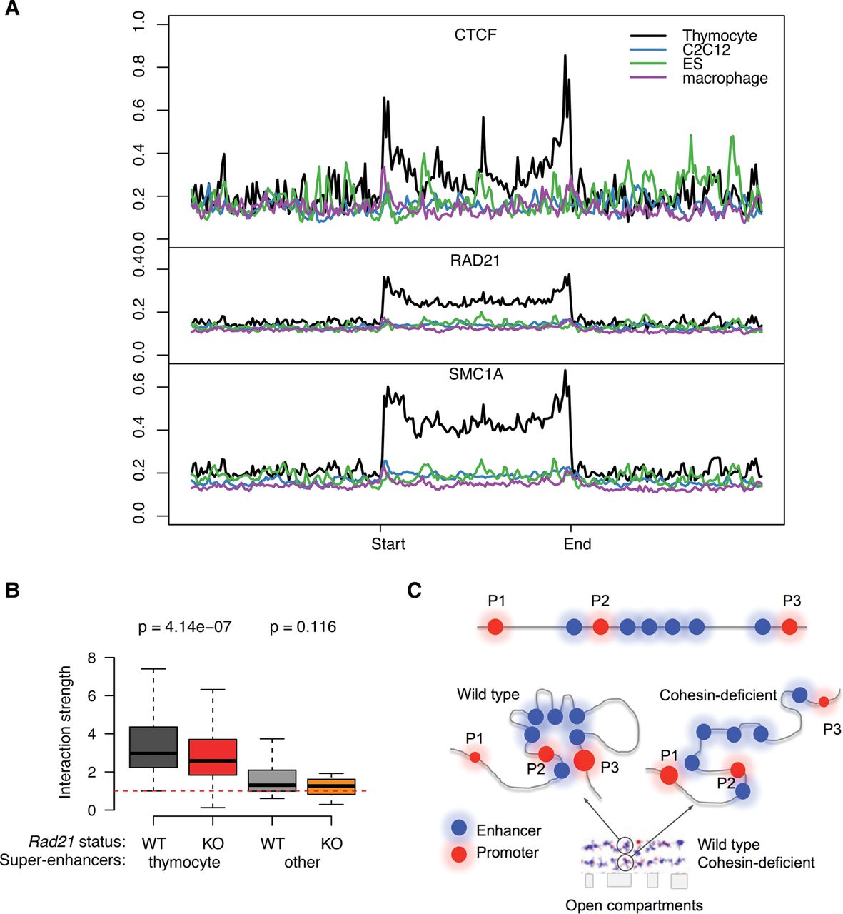 Cell-type specificity of CTCF association and spatial clustering of super-enhancers. (A) CTCF (top), RAD21 (middle), and SMC1A (bottom) ChIP-seq signal in thymocytes at super-enhancers that are active in thymocytes (black), macrophages (purple), myoblasts (blue), or ES cells (green). (B) Preferential interactions within cell-type-specific super-enhancers. SIMA analysis of thymocyte Hi-C data was used to compare interactions within super-enhancers active in thymocytes or other cell types. (Left) Hi-C interactions in control (gray) and Rad21-deficient thymocytes (red) within thymocyte super-enhancers sized 50 kb or more (n = 105). (Right) Hi-C interactions in WT (light gray) and Rad21-deficient thymocytes (orange) within super-enhancers of 50 kb or more that are active in pro-B cells, macrophages, or ES cells (n = 20) (Whyte et al. 2013). P-values shown are from a Wilcoxon signed-rank test. (C) Model for the impact of cohesin-dependent enhancer-enhancer interactions on gene expression. Spatial clustering between enhancer elements can affect promoter activity positively and negatively. The promoters P1 and P3 are both distal to a super-enhancer. P1 is isolated as a result of the spatial clustering between the enhancer elements within the SE, while P3 is connected to the super-enhancer by enhancer-enhancer contacts (left). Removal of cohesin (right) decreases the spatial constraint on enhancer elements so that P1 is contacted more readily by enhancer elements, while P3 dissociates from the super-enhancer.