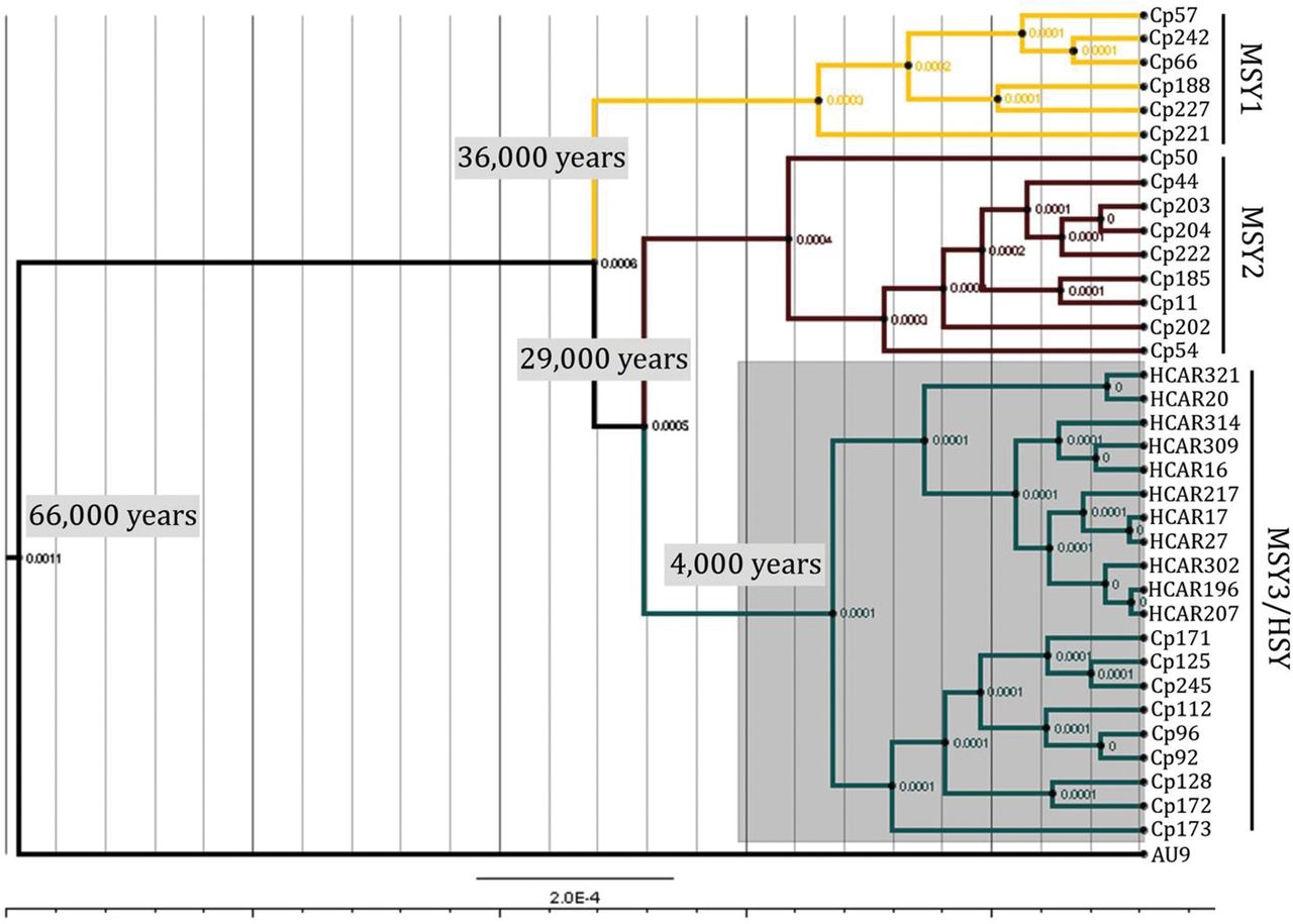Bayesian analysis of Y chromosome divergence times. The MSY1 haplotype subgroup is shown in yellow, MSY2 in brown, and MSY3/HSY in blue. The “AU9” MSY forms an outgroup (in black) to the three populations from Costa Rica. The MYS3/HSY subgroup split is highlighted in gray. Node lengths represent estimated synonymous substitutions per site, which were used with a corrected molecular clock (see Methods) to estimate the divergence times.