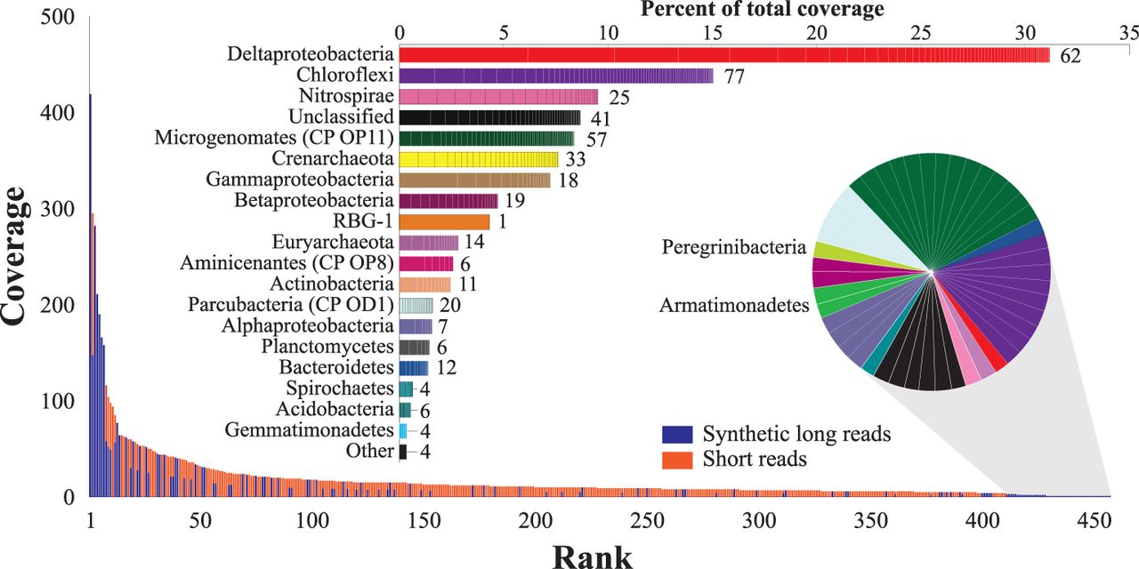 Rank abundance curve for the 5-m community including all species for which the rpS3 gene could be recovered. (Bottom) While most of the rpS3 genes were recovered from the short-read assembly (orange), least and most abundant species were represented almost exclusively by the long-read data (blue). (Top) Stacked bar graph shows abundance of phyla and Proteobacteria classes; stacked boxes indicate abundance of individual species (number of species indicated). Deltaproteobacteria is the most abundant lineage in the sample, with five of the seven most abundant species being closely related. (Pie chart) Species with zero short-read coverage in the short-read data, detected in the synthetic long reads only.