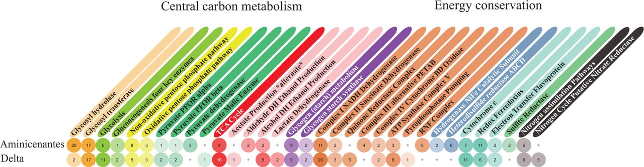 Summary of metabolic potential for the Deltaproteobacteria (5-m) and Aminicenantes (4-m) strains.