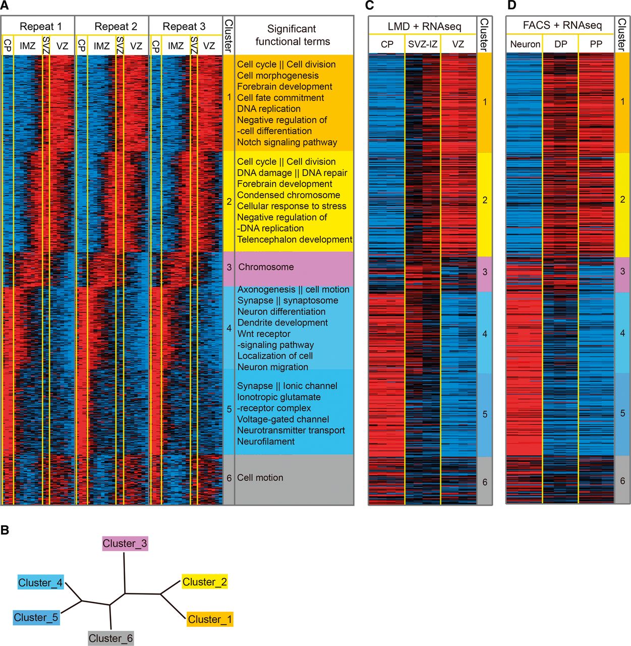 VZ to CP ISH profile-based spatial gene expression clusters. (A) Spatial expression profiles of telencephalon-expressed genes were clustered using the Super k-means algorithm with k = 6 and laid out according to their highest expression location, from the ventricle side moving outward. Cortical layers (Takahashi et al. 1995a,b) can be approximately separated into four zones, the CP, IMZ, SVZ, and VZ, as delimited by the yellow vertical lines. Gene expression profiles were extracted based on gray-scale pixel intensities as illustrated in Figure 1. Each column represents one of the 60 bins from the three neighboring lines marked on each image. Each row represents one of the 1816 images (for the 1598 Entrez genes and 53 miRNAs, all digitized expression intensity values are provided in Supplemental Table S3). The functional GO or KEGG terms enriched within each cluster of genes are listed next to the heatmap. (B) Neighbor-joining tree of the six clusters based on their average expression profiles. (C) RNA-seq expression levels of panel A genes (1561 detected RefSeq genes) in the six microdissected samples from the CP, SVZ-IZ (SVZ-IMZ), and VZ, respectively (two samples from each region and two technical repeats for each sample). (D) RNA-seq expression levels of panel A genes (1521 detected RefSeq genes) in three cell types (three samples from each cell type). (PP) Proliferative progenitor, (DP) differentiating progenitor.