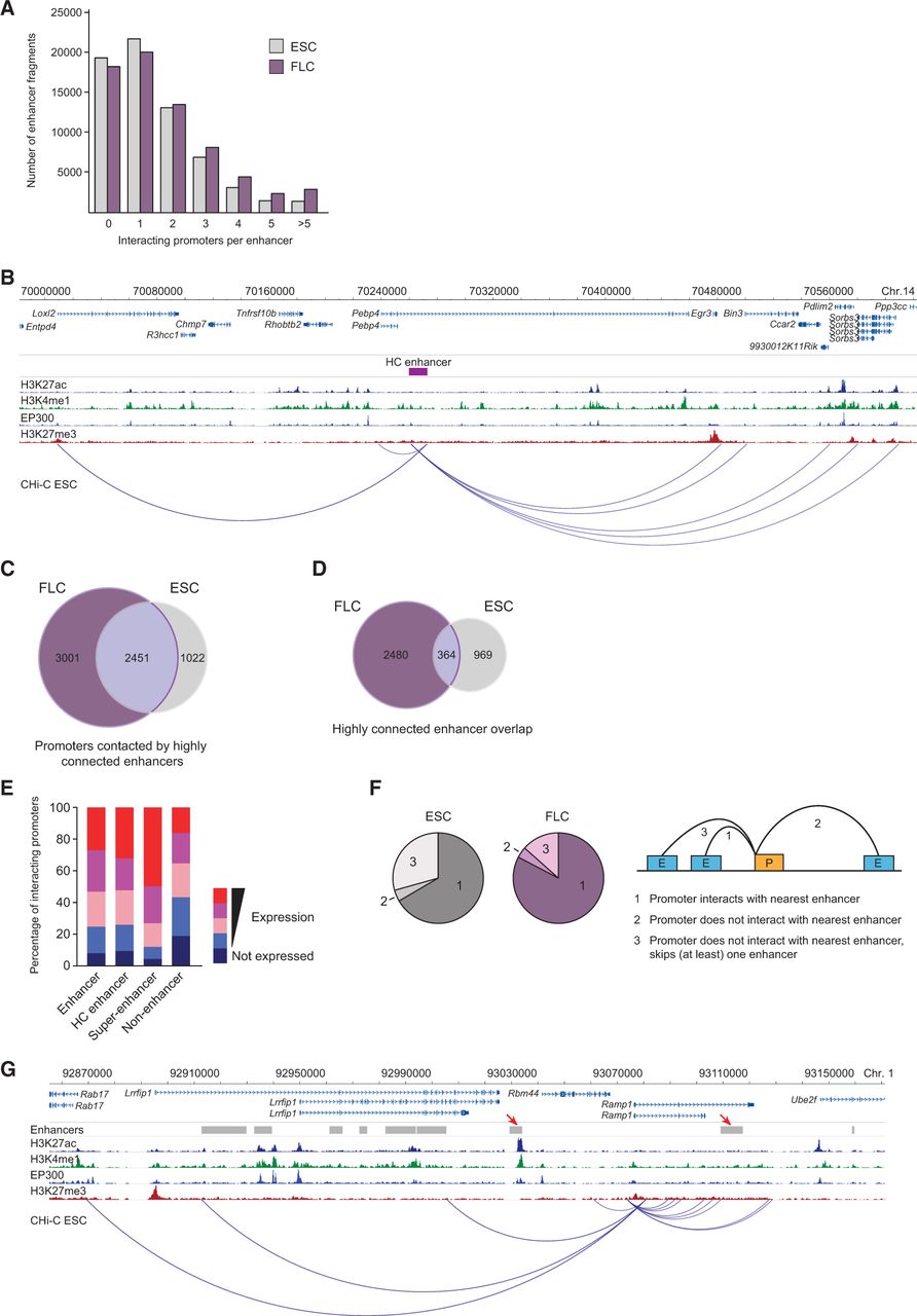 Promoter-enhancer 3D circuitry. (A) Number of enhancer elements interacting with between zero and more than five promoters in ESCs and FLCs. (B) Example of highly connected (HC) enhancer (represented by purple rectangle) contacting multiple gene promoters in ESCs. (C) Numbers of unique and overlapping promoters interacting with highly connected enhancers in ESCs and FLCs. (D) Numbers of unique and overlapping highly connected enhancers in ESCs and FLCs. (E) Percentage of promoters in the separate expression categories that contact enhancers, highly connected (HC) enhancers, super-enhancers, and nonenhancer elements in ESCs. (F) Percentages of active promoters interacting with the nearest enhancer (on the linear genomic map), a more distally located enhancer, or skipping (at least) one enhancer in ESCs and FLCs, as illustrated by schematic on the right ([P] promoter; [E] enhancer). (G) Example of an active promoter (Ramp1) bypassing proximal enhancers (red arrows) in ESCs.