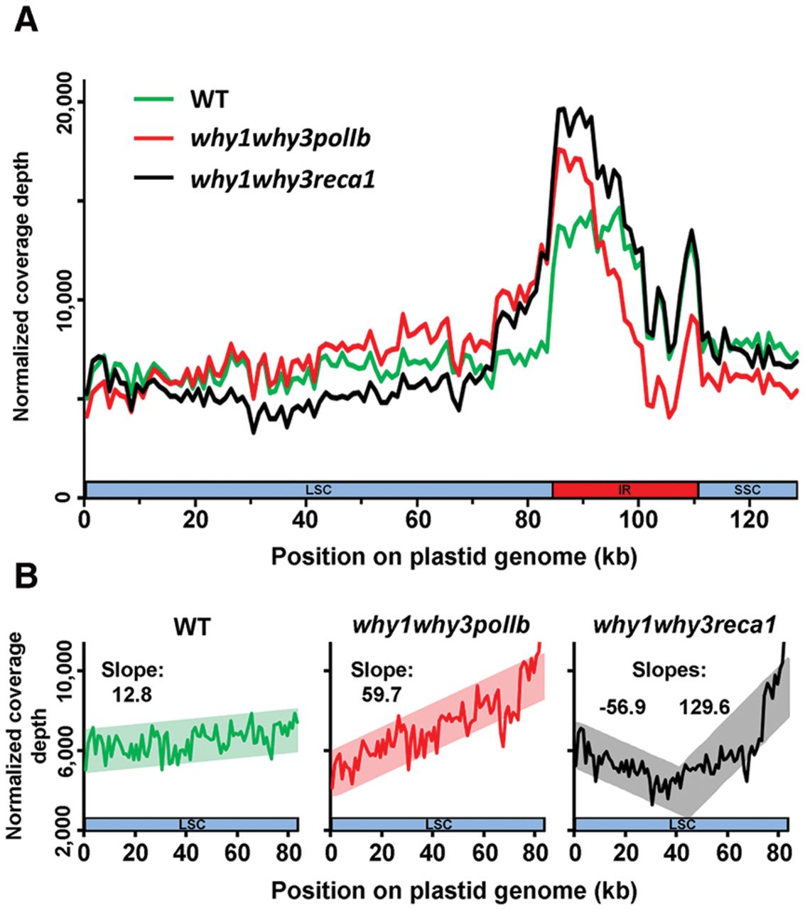 Plastid DNA sequencing coverage curves for Arabidopsis lines WT, why1why3polIb, and why1why3reca1. (A) Plastid sequencing coverage of pools of 14-d-old Arabidopsis seedlings of the indicated genotypes. Positions were rounded down to 1 kb. All reads mapping to the plastid large inverted repeats (IRs) were only assigned to the first IR. The plastid large single-copy region (LSC), the first IR, and the small-single copy region (SSC) are depicted as a long blue bar, a red bar, and a short blue bar, respectively. The y-axis represents the number of reads per 1,000,000 total plastid reads. (B) Regression analysis of the plastid LSC sequencing coverage of WT, why1why3polIb, why1why3reca1 seedlings. Positions were rounded down to 1 kb. The y-axis represents the number of reads per 1,000,000 total plastid reads.