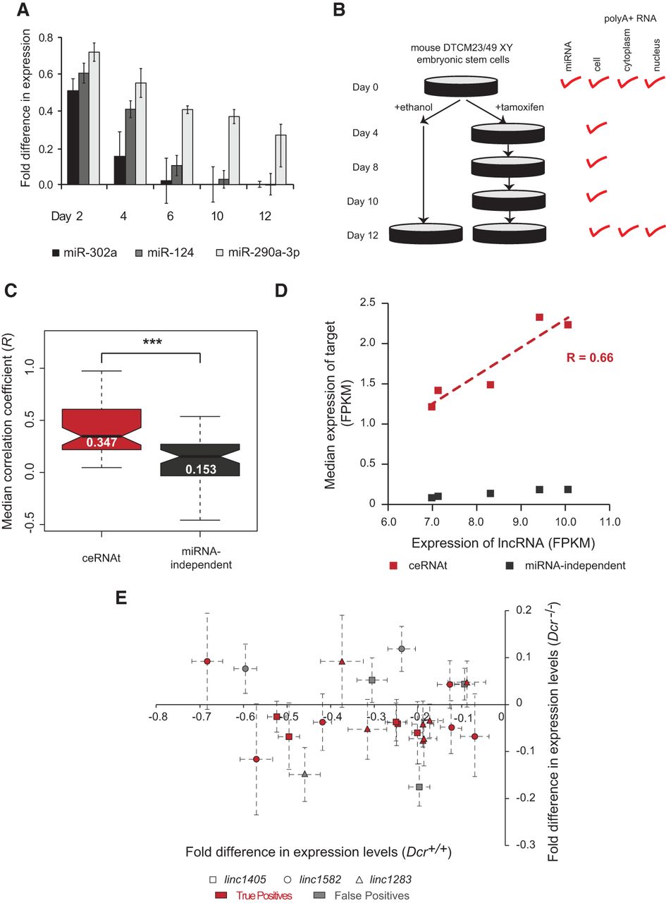 The expression levels of lncRNAs and their ceRNAts are positively correlated upon loss of miRNA biogenesis. (A) Loss of miRNA biogenesis (Dcr−/−) is associated with decreased levels, relative to the wild-type control, of mature miR-302a (black), miR-124 (dark gray), and miR-290a-3p (light gray) abundance over a 12-d time course. Fold difference in expression relative to controls was determined using qRT-PCR in triplicate. (B) Long poly(A)-selected RNA from total cellular extracts of DTCM23/49 XY mouse embryonic stem cells (mESCs) was collected on days 0, 4, 8, 10, and 12 following exposure to tamoxifen. Long poly(A)-selected RNA was also collected from the nucleus and cytoplasm of these cells before (0) and 12 d after treatment with tamoxifen. Total RNA used to quantify miRNA expression was extracted before tamoxifen treatment. (C) Median correlation coefficients between lncRNA expression and their respective ceRNAts (red, median R = 0.347) and miRNA-independent targets (dark gray, R = 0.153) over the 12-d time course following loss of miRNA biogenesis. (D) Pearson's correlation between linc1510’s expression (average across replicates of the gene expression measured as fragment per kilobase of exon per million reads mapped [FPKM], x-axis) and the median expression of all of its targets annotated as either ceRNAts (R = 0.66, red) or miRNA-independent targets (R = 0.19, dark gray) at each time point (y-axis). (E) Fold difference in normalized (using Gadph) gene expression following knockdown of linc1405 (square symbols), linc1582 (circles), or linc1283 (triangles) and siRNA transfection control in Dcr+/+ (x-axis) or Dcr−/− (y-axis) mESCs. True and false ceRNA positives are highlighted in red or gray, respectively. Error bars represent S.E.M. across replicates. (***) P < 0.001.