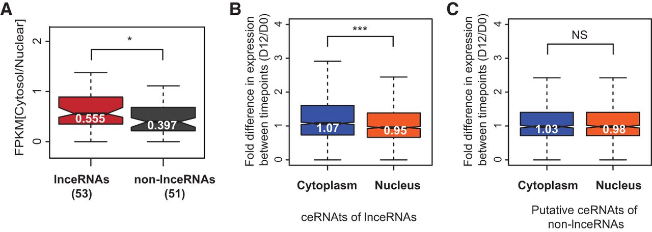 lnceRNAs are enriched in the cytoplasm. (A) Ratio between gene expression (in FPKM) in the cytoplasmic and nuclear fraction for lnceRNAs (red, r = 0.555) and lncRNAs that were not annotated as lnceRNAs (gray, r = 0.397). Relative fold difference in expression measured in the cytoplasm (blue) and nucleus (orange) of cells before (day 0) and after (day 12) Dicer1 loss-of-function for ceRNAts and putative ceRNAts of (B) lnceRNAs and (C) non-lnceRNAs. Median fold differences are shown in the corresponding box plot. (NS) Not significant, (*) P < 0.05, (***) P < 0.001.
