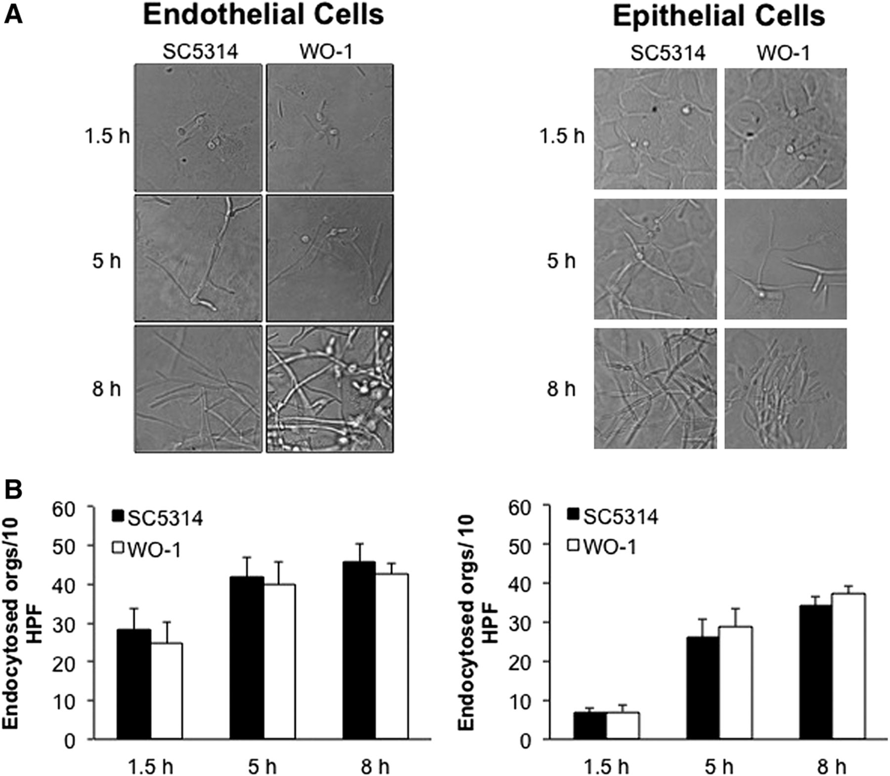 Interaction of C. albicans strains with each of the host cell types. (A) Microscopic images of endothelial cells and epithelial cells infected with each C. albicans strain for 1.5, 5, or 8 h in vitro. (B) A quantification of endocytosis for each C. albicans strain in each of the host cell lines at 1.5, 5, and 8 h post-infection. Results are the mean ± SD of three experiments, each performed in triplicate.