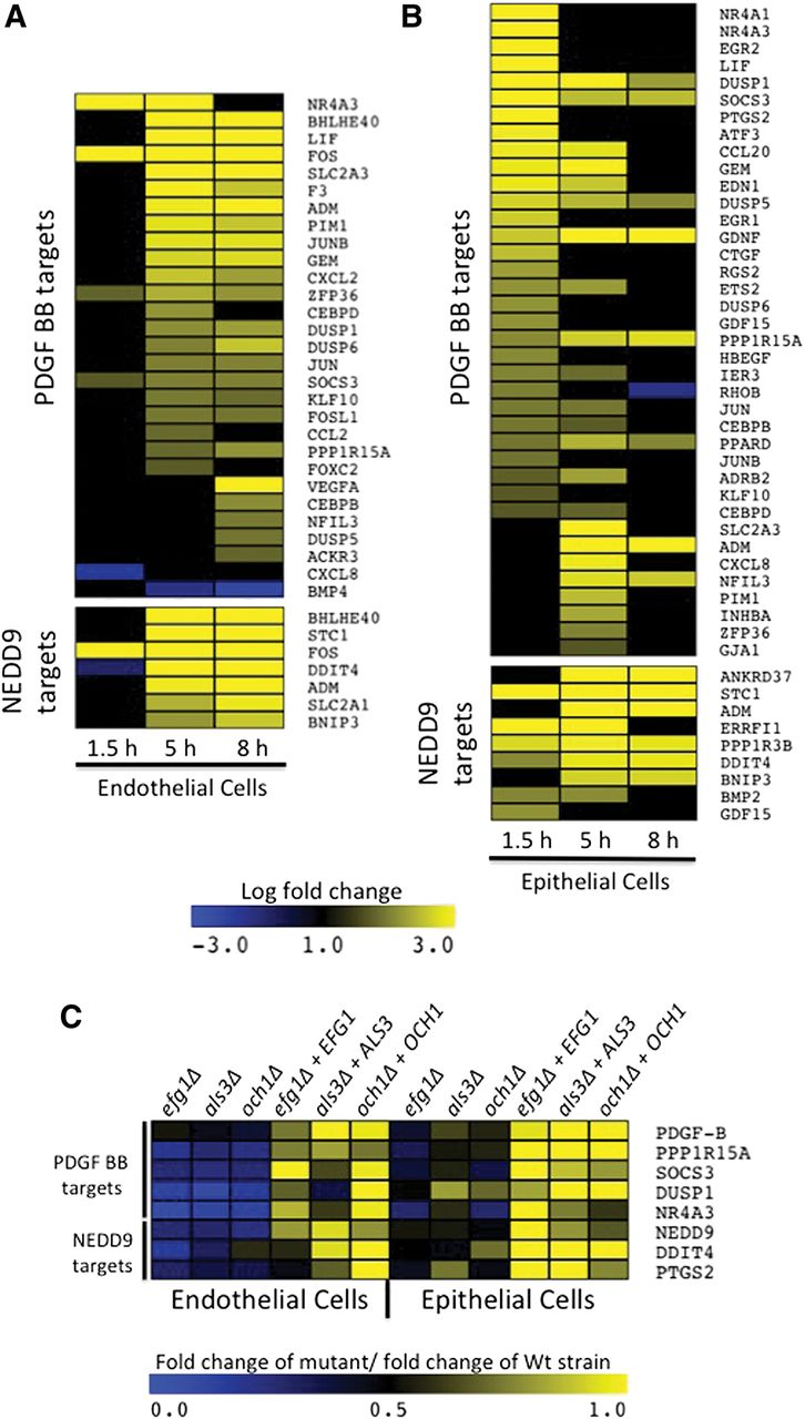 Regulation of PDGF- and NEDD9-pathway targets during in vitro infection. (A,B) Differential expression of PDGF- and NEDD9-target genes during infection of endothelial cells (A) and epithelial cells (B). Values represent log fold change expression relative to uninfected controls (RNA-seq expression values during infection divided by expression during uninfected mock infection). Yellow indicates increased expression during infection; blue indicates reduced expression during infection. (C) Differential expression of PDGF- and NEDD9-target genes during infection with invasion-defective C. albicans mutants. Values represent fold change differences in induction by mutant strain divided by induction by appropriate wild-type strain as determined by qRT-PCR.