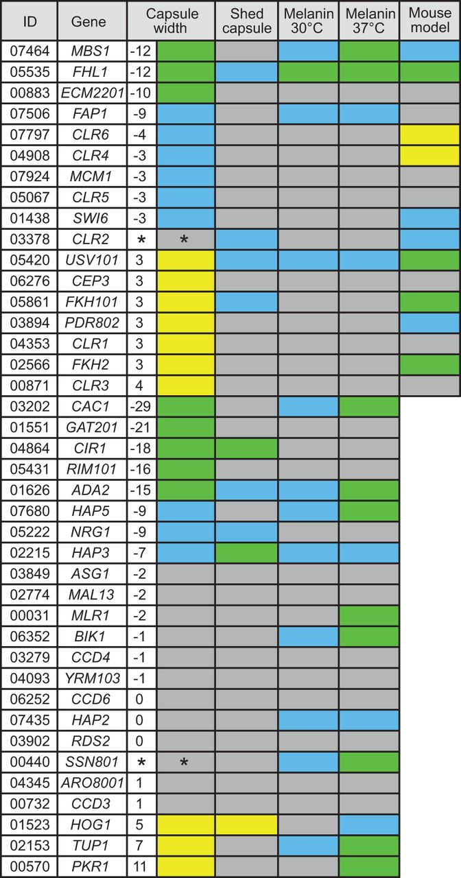 TF mutants have significant virulence-related phenotypes. For capsule, the difference in thickness from WT (in pixels) is tabulated and also color-coded: (green) a decrease of ≥10 pixels compared to wild type; (blue) a decrease of 3–9 pixels; (yellow) an increase of ≥3 pixels; (*) denotes strains with WT mean capsule thickness but significantly increased variance. For melanin formation, green indicates colonies that were white (no melanin) to beige, and blue indicates colonies that were brown but lighter than WT. For capsule shedding, green indicates that the 3-h culture supernatant concentration of GXM was ≥8-fold lower than WT; blue, two- to fourfold lower; and yellow, twofold higher. For short-term infectivity, fold-change in colony-forming units (CFU) in 1 wk was calculated (tested only for strains with newly discovered capsule phenotypes): (green) >10 times lower than WT; (blue) 2–10 times lower; (yellow) >2 times higher. In all columns gray indicates no significant change in phenotype.
