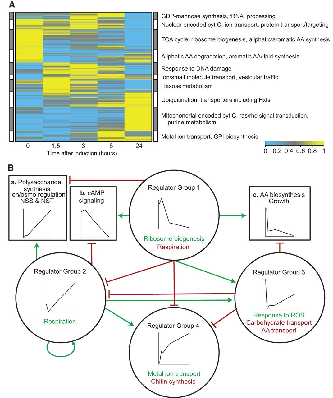 The dynamics of gene regulation over 24 h of capsule induction. (A) Heat map of genome-wide expression profiling: (blue) low expression; (yellow) high expression. Examples of functional annotations of genes in each cluster are indicated. (B) Regulatory relations among groups of capsule-involved genes clustered by temporal expression pattern: (circles) groups of regulators clustered by their temporal expression patterns (insets); text denotes representative functions of their activated (green) or repressed (red) targets; (boxes) capsule-involved target genes clustered by their temporal expression patterns (insets); text provides examples of target gene functions; (green arrows) activation of designated targets; (red T-heads) repression of designated targets. Regulator Group 1 is Clr1, Hap5, Nrg1, Pkr1, and Ssn801; Regulator Group 2 is Cac1, Cep3, Cir1, Clr2, Fap1, Fhl1, Fkh2, Gat1, Mcm1, Pdr802, Sp1, Swi6, and Usv101; Regulator Group 3 is Clr6, Hog1, Mbs1, Ste12alpha, and Tup1; Regulator Group 4 is Ada2, Clr3, Clr4, Clr5, Ecm2201, Fkh101, Gat201, Hap3, and Rim101. (NSS) Nucleotide sugar synthesis; (NST) nucleotide sugar transport; (ROS) reactive oxygen species.